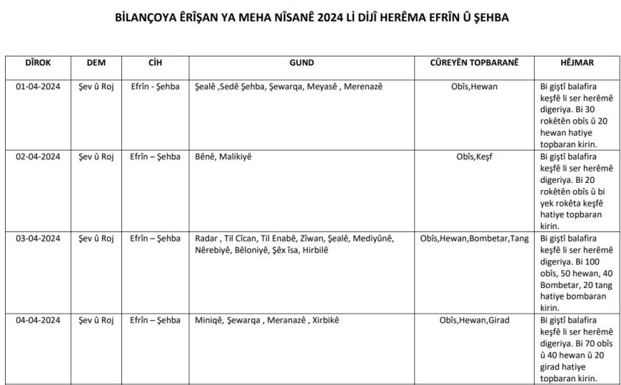 NAVENDA NÛÇEYAN – Navenda Ragihandina Hêzên Rizgariya Efrînê (HRE) bîlançoya êrişên dewleta Tirk a dagirker û çeteyên wê yên ku di meha nîsanê de li ser herêma Efrîn -Şehbayê pêk anîne, eşkere kir.