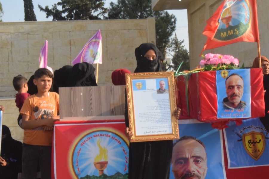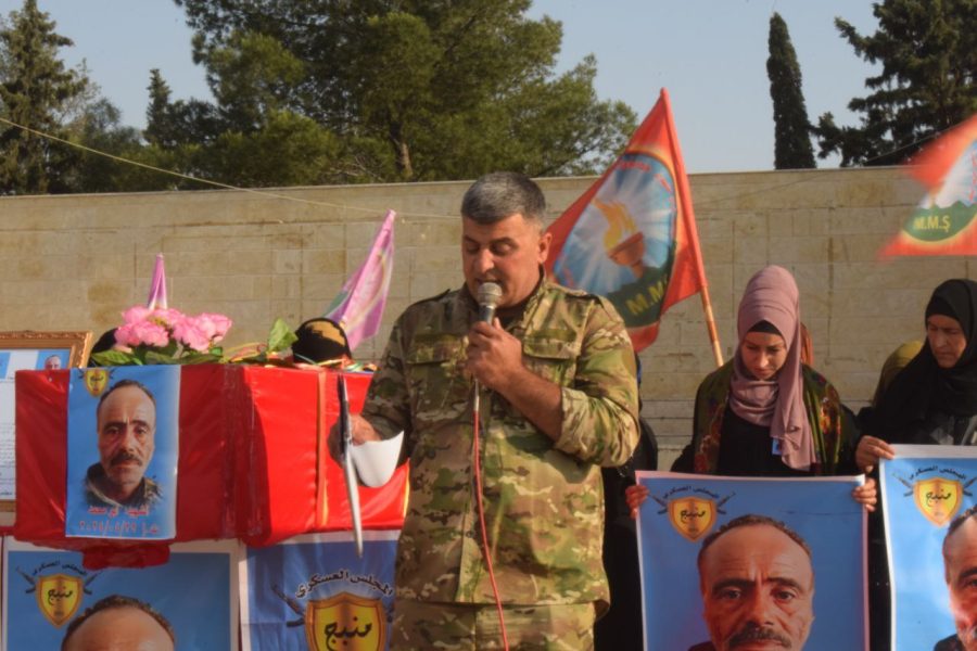 MINBIC – Cenazeyê şervanê Meclîsa Leşkerî ya Minbic Ehmed Mihemed El-Mubarek bi merasîmekê li goristana şehîdan a bajarê Minbicê hate oxirkirin. Şêniyên gelê Minbicê, Tevgera Ciwanên Şoreşger û saziyên sivîl, leşkerî û tevgerên jin beşdarî merasîmê bûn.