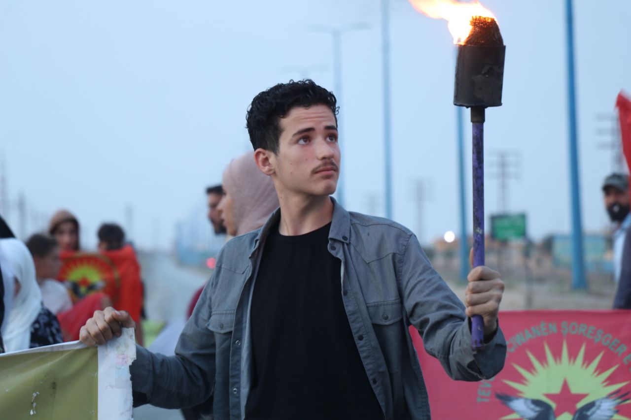 Meş ji ber Nexweşxaneya Niştîmanî ber bi dorhêla El-Eşra ve destpê kir. Ciwan û Jinên Ciwan banga rakirina tecrîda li ser Rêber APO kirin û vejîna hêzên gerîla silav kirin. Di daxuyaniya ciwanan de ser pêkanînen hovanê dewleta dagirker a tirk bal kişand û daxwaza azadiya fîzîkî ya Rêber APO diyar kir. Ciwanên Dêrazor diyar kirin ku bi biriyarin heya van êrîşên li hemberî Rêber APO na rawestin û Rêber APO azad nebe tekoşîn û berxwedan jî bidominê.