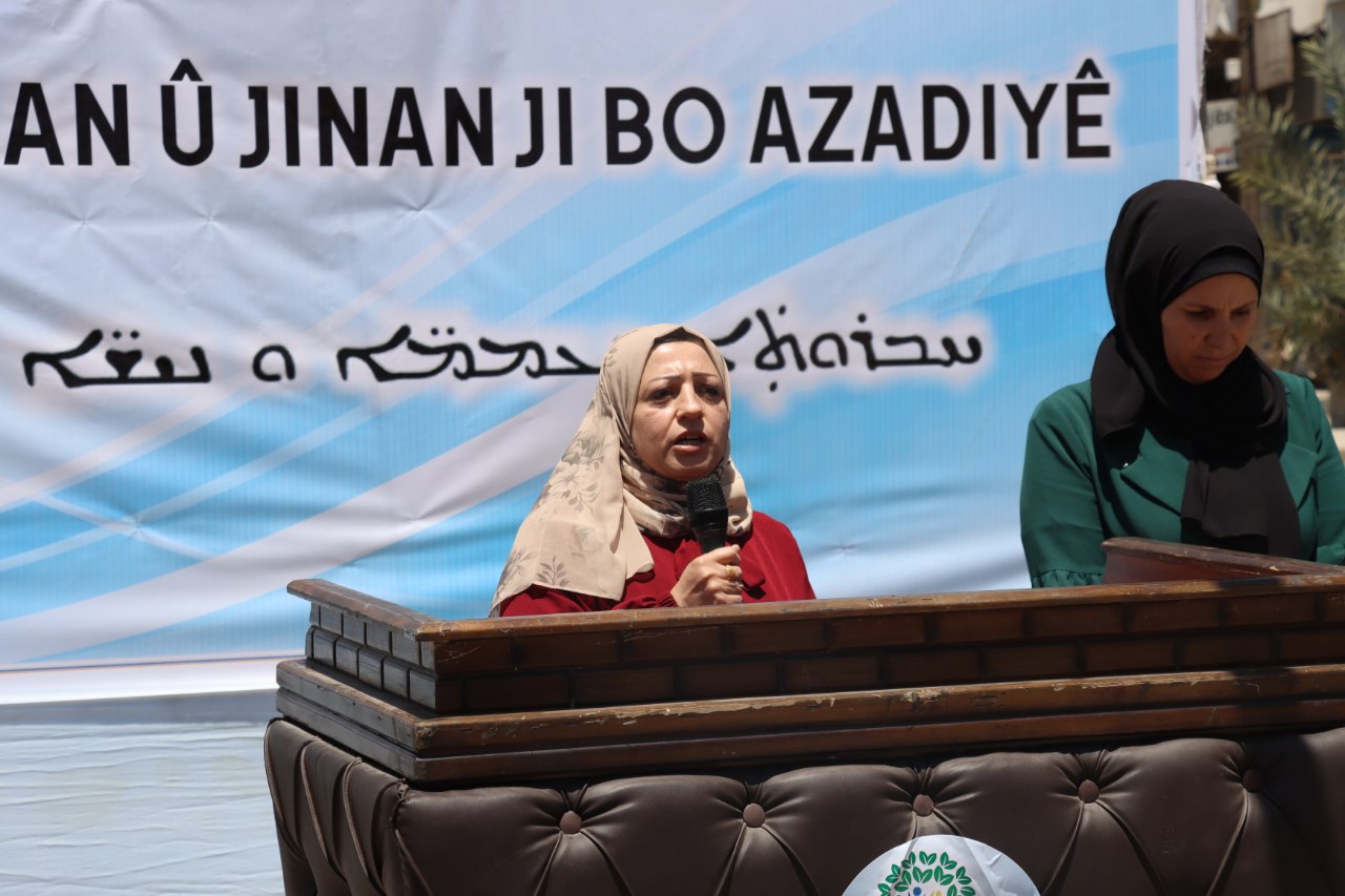 Namzeta Ruwaida Hnaidal got: “Bi îradeya jina azad em ê civakeke demokratîk a azad, tifaqa gelan û jinan ji bo azadiyê, dengê xwe, vîna xwe ava bikin. Piştî wê hevserokê komîteya şaredariyê Pervan Derwîş û Mehmûd Diab axivîn. Di dawiyê de govendên gelerî hatin girtin.