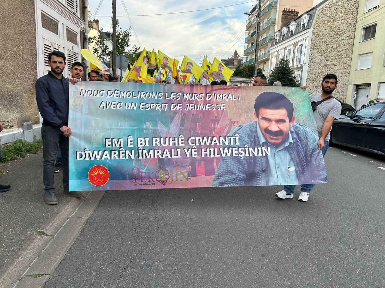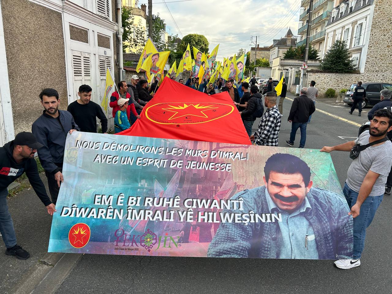 Di meşê de dirûşmên “Bijî Serok APO”, “Ciwan Fedaiyên Rêber APO ne”, “Bê Serok Jiyan Nabe”, Bijî Berxwedana Zindana” û Fransî hatin qîrîn.