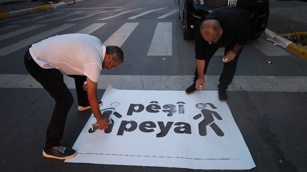 STENBOL- Hevberdevkê Kongreya Demokratîk a Gelan (HDK) Cengîz Çiçek û Parlamanterê Partiya Wekhevî û Demokrasiyê ya Gelan (DEM Partî) Celal Firat li dijî jêbirina nivîsên hilyariyê yên “Pêşî Peya” ên bi kurdî ku li Kurdistanê tên jêbirin”, li navçeya Eyupsultan a Stenbolê li ser Kolana Cengîz Topelê “Pêşî Peya” nivîsandin.
