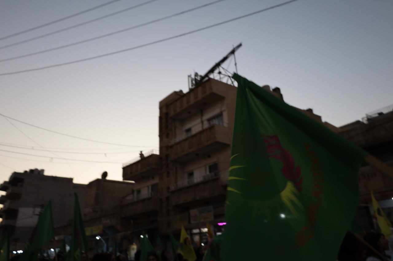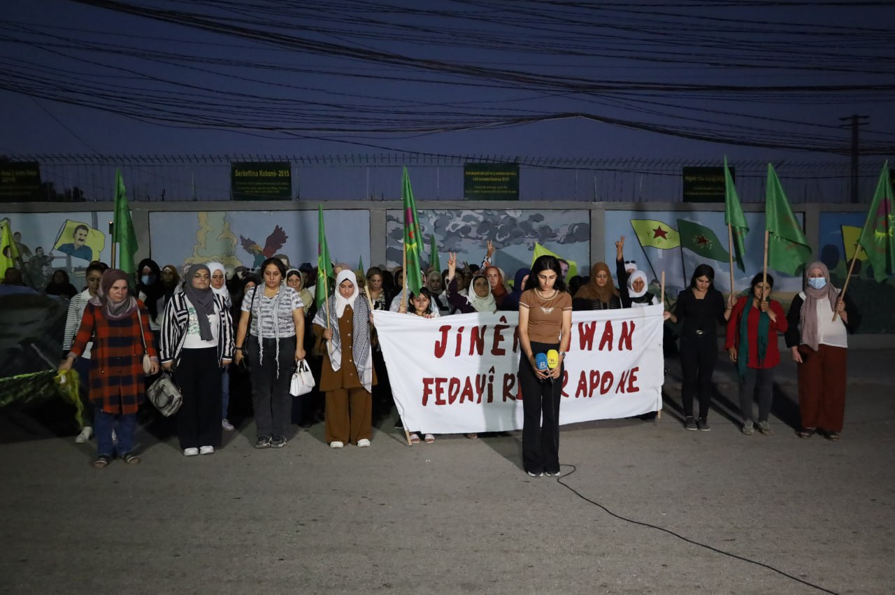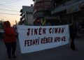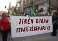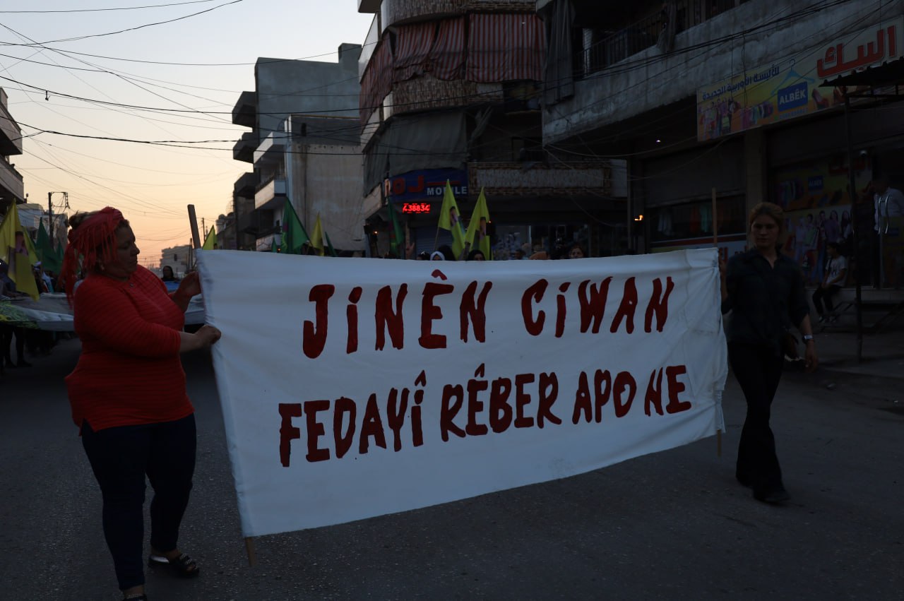 Di meşê de pankartên wêneyên Rêber APO û alên Yekîtiya Jinên Ciwan hatin rakirin û dirûşmên “Bê Serok Jiyan Nabe, Bijî Serok APO” hatin berzkirin.