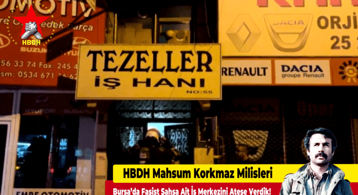NAVENDA NÛÇEYAN – HBDH (Tevgera Şoreşgerî ya Yekbûyî ya Gelan) bi wesîleya salvegera 40. a Pêngava 15’ê Tebaxê daxuyaniyeke nivîskî weşand û diyar kir ku li Bursa/Demirtaşpaşa Mah. ‘Navenda Karsaziya Tezeller’ a li ser Kolana Kibrîs Şehîtlerî ye ku gelek malzemeyên buroyê yên faşîstekî AKP’ê lê hatin dîtin hat ragihandin ku, di 8’ê Tebaxê de ji aliyê Milîsên HBDH’ê Mahsum Korkmaz ve hatiye şewitandin.