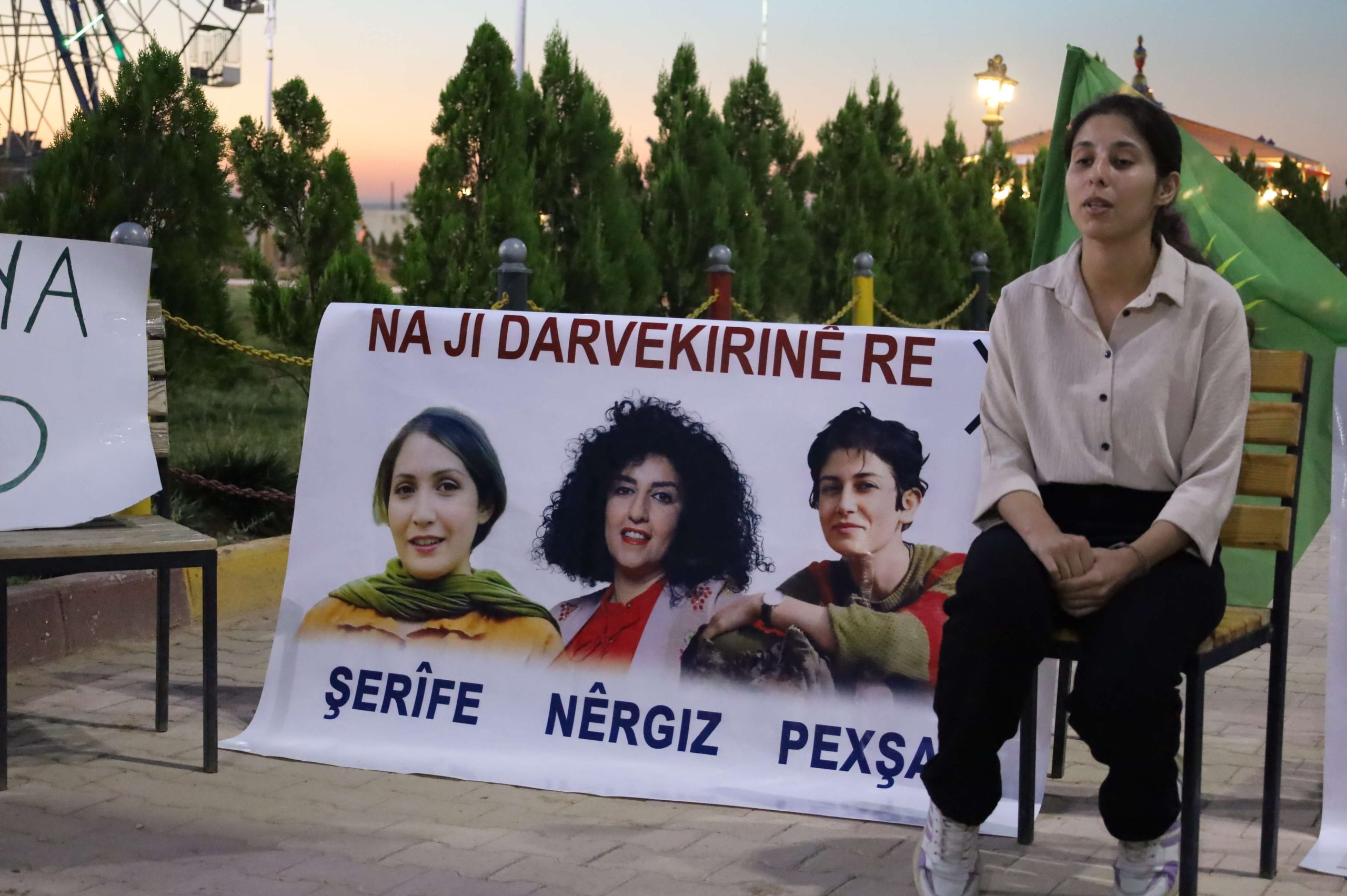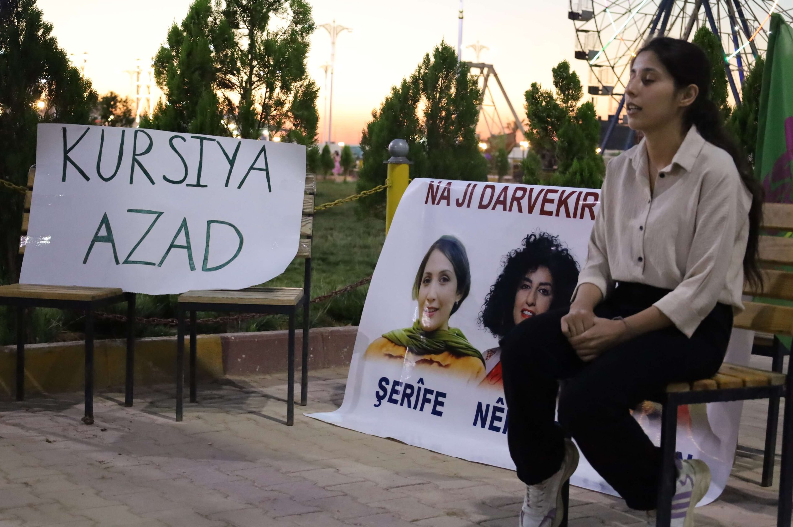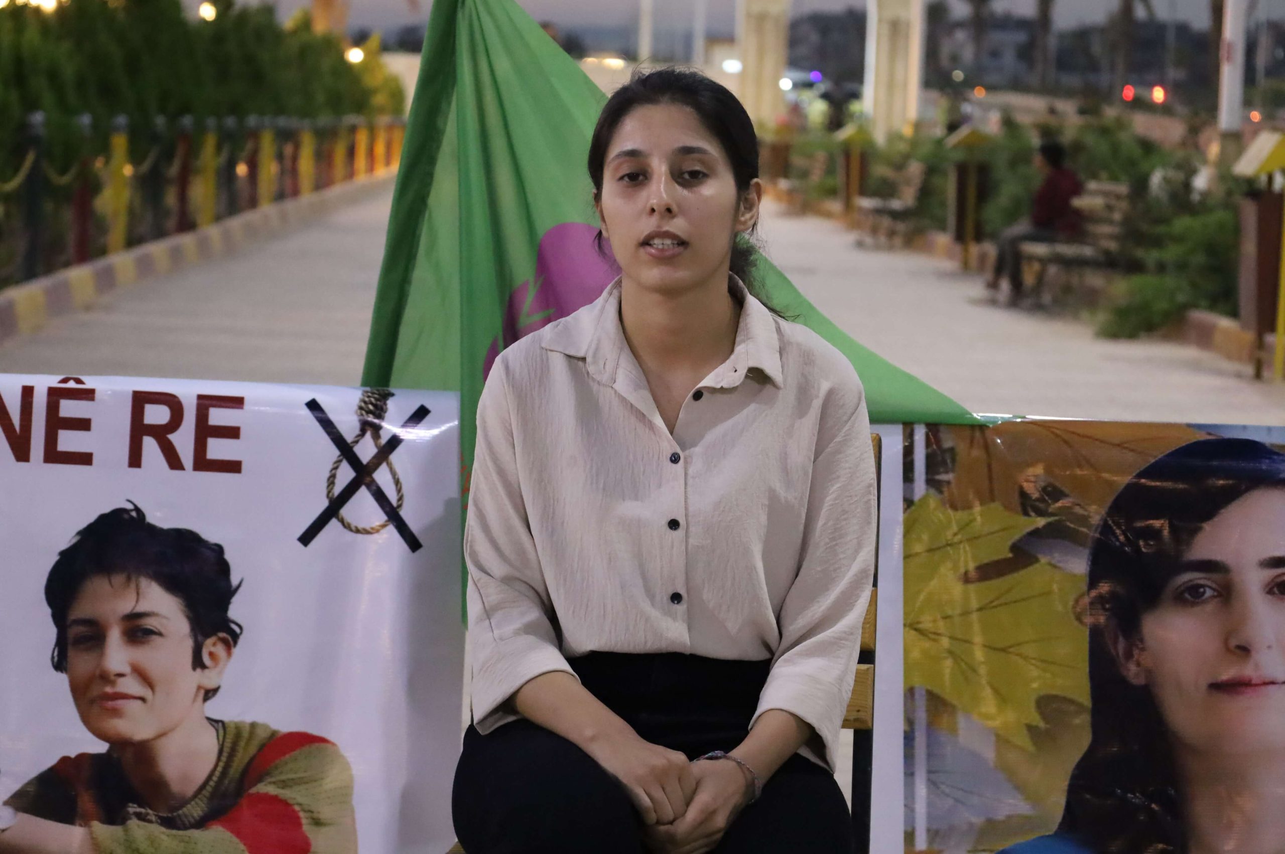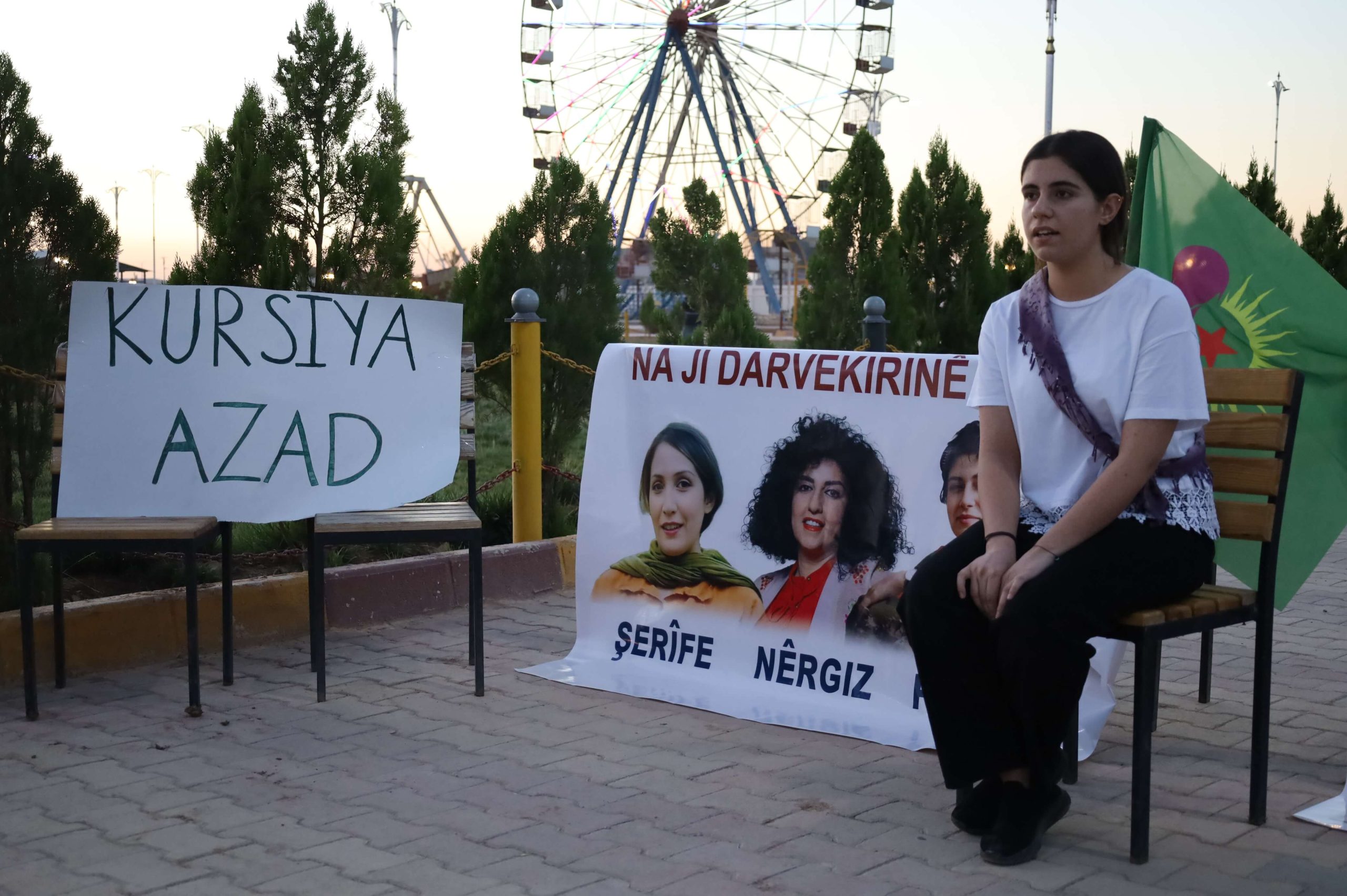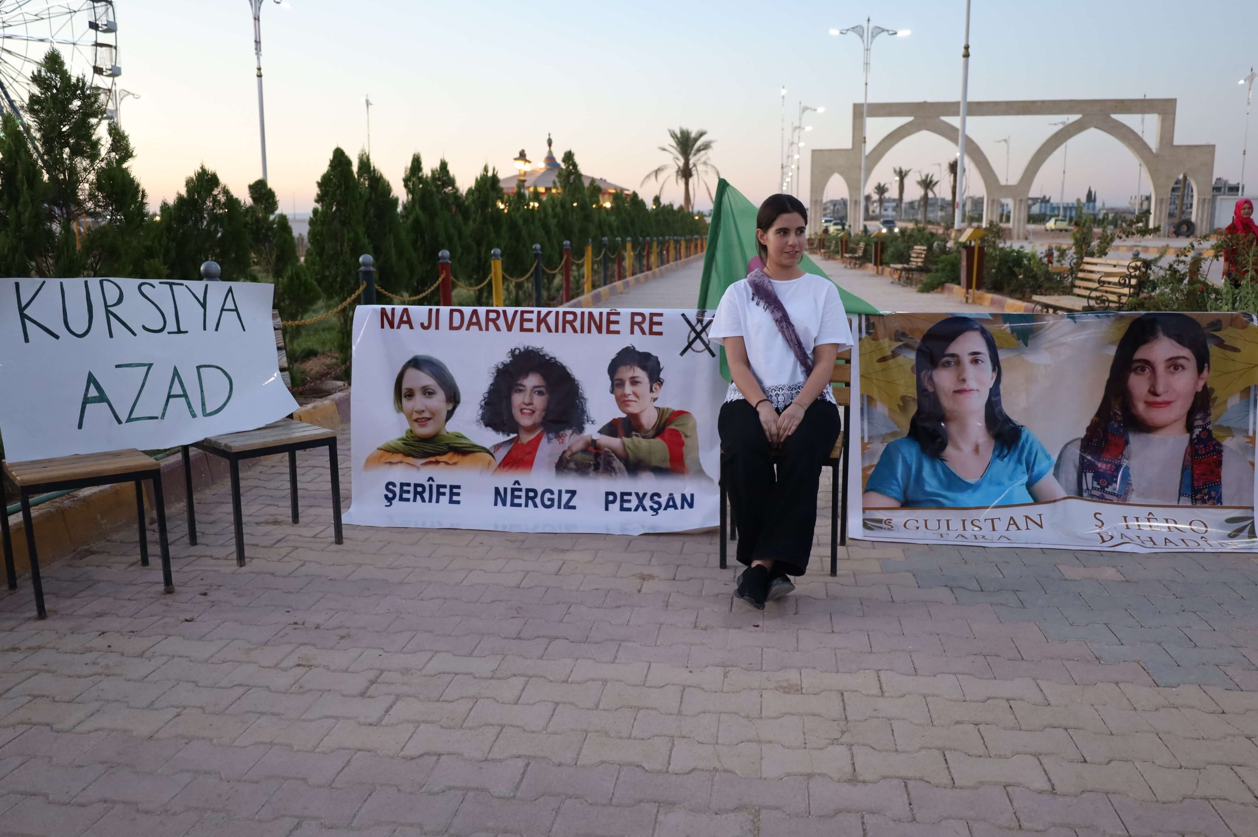 Jinên Ciwan pankartên aktîvîstên kurd yên ku li ser wan biriyara darvekirin hat girtin hildan. Yek bi yek, jinên ciwan li ser “kûrsiya azad” rûniştin û helwesta xwe li beramberî darvekirina jinan anîn ser ziman.
