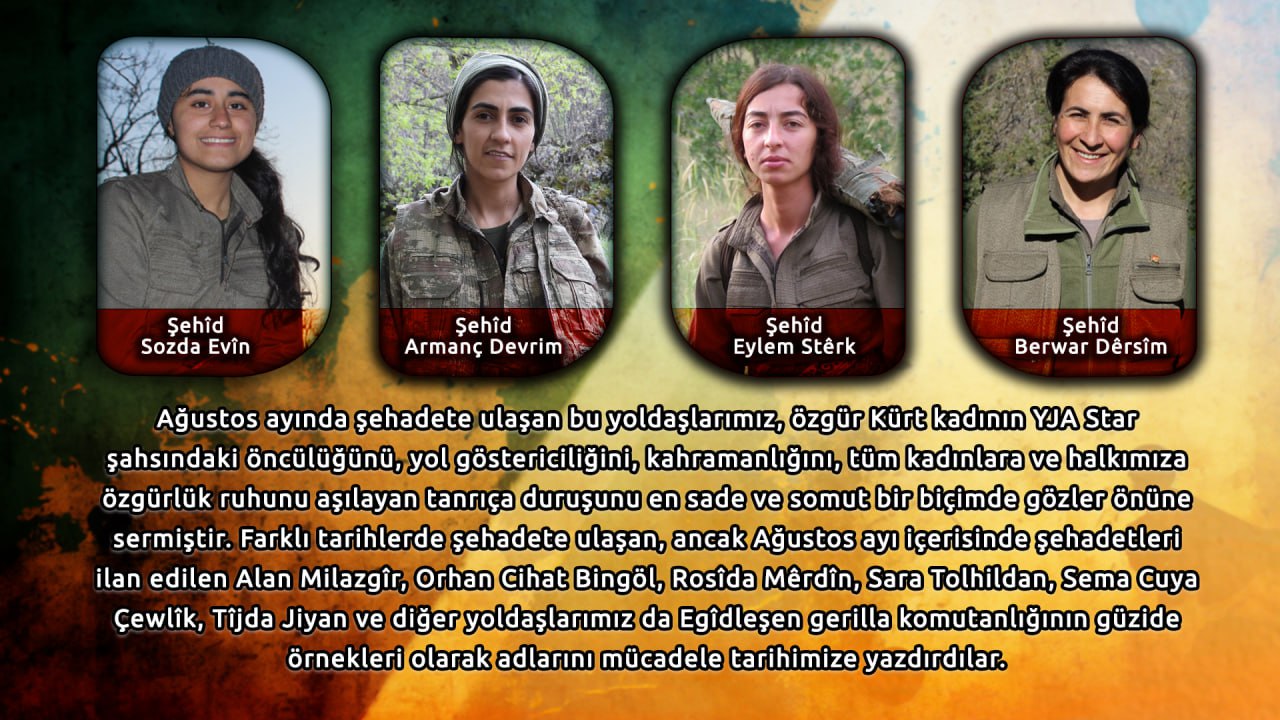 Gerîlayên Azadiyê yên Kurdistanê sala 41’emîn a Cejna Vejînê, pêngava gerîla ya dîrokî 15’ê Tebaxê bi heybet pêşwazî kirin. Gerîlayên me ku bi biryardarî û ruhê fedaî yê Apoyî dest bi sala têkoşînê ya 41’emîn kirin, li Bakurê Kurdistanê û Herêmên Parastinê yên Medyayê bi rengekî bênavber li ber xwe dan. Berxwedana destanî ya fermandara me ya fedaiyan a nemir Berwar Dersîm – Seyran Çomak a li Çiyayê Agirî, nîşanî dost û dijminan da ku heqîqeta Egîdbûyîn, Bêrîtanbûyîn û Zîlanbûyînê ya jinên Kurd ên azad têk naçe. Berxwedana nayê teslîmgirtin a hevrêyên me Eylem Stêrk – Meryem Onur, Sozdar Evîn – Betul Aydin û Armanc Devrîm – Hacer Tekîn a li Elkê û Kato Marînos heman heqîqet li qadên cuda raxist pêş çavan. Ev hevrêyên me ku di meha Tebaxê de şehîd bûn, pêşengî û lehengiya jinên Kurd ên azad di şexsê YJA Starê de nîşanî hemû jinan da, ruhê azadiyê da gelê me û jinan. Hevrêyên me Alan Milazgîr, Orhan Cîhat Bîngol, Rosîda Mêrdîn, Sara Tolhildan, Sema Cuya Çewlîk, Tîjda Jiyan û hevrêyên me yên din ên di demên cuda de şehîd bûn lê belê di nava meha Tebaxê de şehadeta wan hate ragihandin, bûn mînakên bijarte yên fermandariya gerîla ya Egîdbûyînê û bi vî rengî navê xwe li dîroka me ya têkoşînê nivîsandin. Em hevrêyên xwe yên ku li ser şopa fermandar Egîd meşiyan, bi lehengî şer kirin û şehîd bûn bi rêzdarî û minetdarî bi bîr tînin û diyar dikin ku em ê şopdarên şehîdan bin û careke din soz didin ku armancên wan teqez bi ser bixînin.
