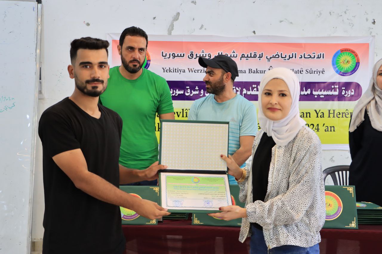 Di dawiya dewreyê de ku bi test û nirxandinên teorîk û pratîk bi dawî bû, belgeyên pejirandîkirina rahêneran hatin belavkirin û ji bo rahêneran destûr hat dayîn ku li herêmên Bakur û Rojhilatê Sûriyê çalakiyên werzîşê li dar bixin û tevlî malbata Federasyona Sporê ya Herêma Rojhilatê Sûriyê bibin.