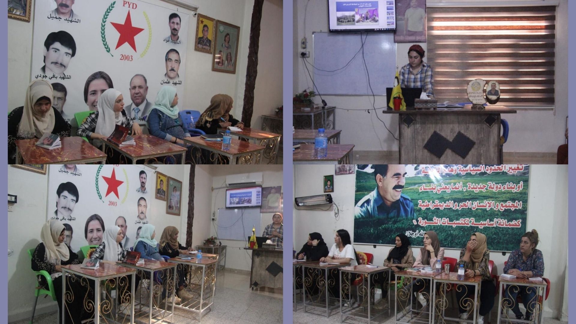 Di dewreya perwerdeyê ya 14 rojan de dersên bi navê Zayendî, Şerê Taybet, Rastiya Dijmin, Jin û Malbat, Rastiya Rêbertî, Dîroka Jinê, Jineolojî, Şerê Gel ê Şoreşgerî, Nasnameya Jinên Ciwan û Modela Rêxistinî ya Ciwanên PYD’ê hatin dayîn.