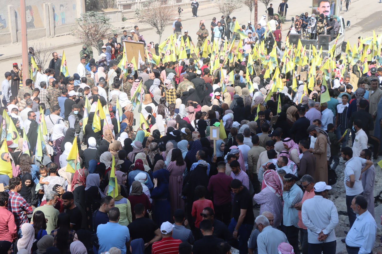 Meşa li ser bangewaziya Însiyatîfa ji bo azadiya Rêber APO li dar ketiye, ji qada Navenda Perwerdeyê ya li bajarê Reqayê dest pê kir. Meşvanan, wêneyên Rêber APO, pankartên “Azadiya fîzîkî ji Rêber APO re, tunekirin ji dagirkeriya Tirk re” hildan û sloganên “Na ji tercrîdê re”, “Ji Serok re azadiya fîzîkî”, “Bê Serok jiyan nabe” û “Tirkiya faşîst” berz kirin.