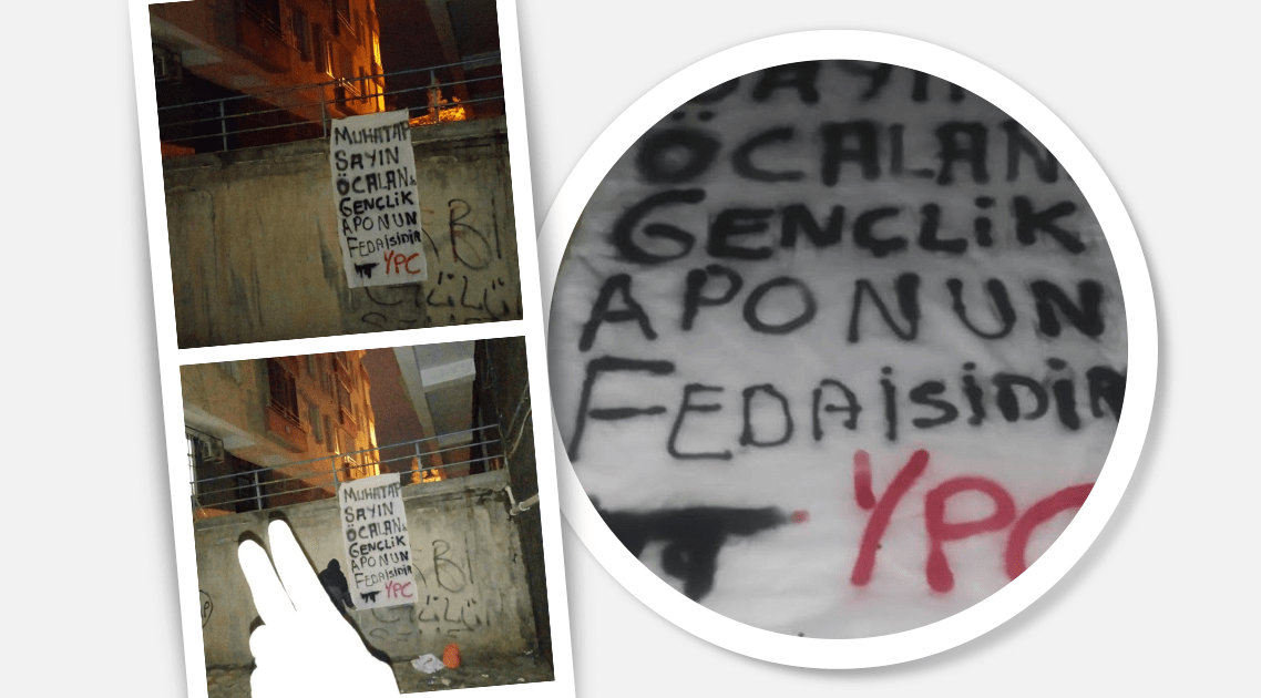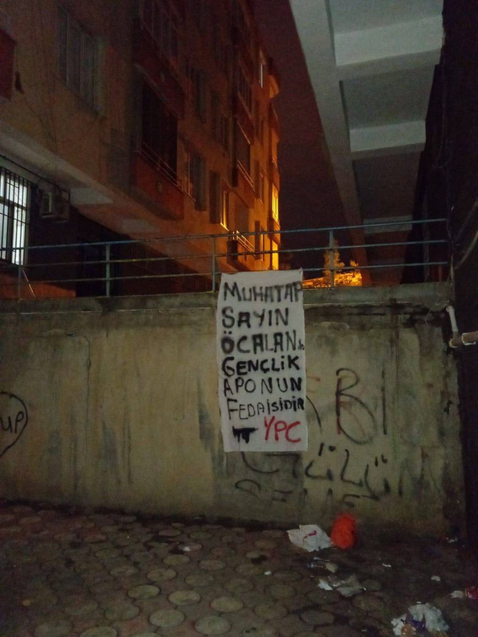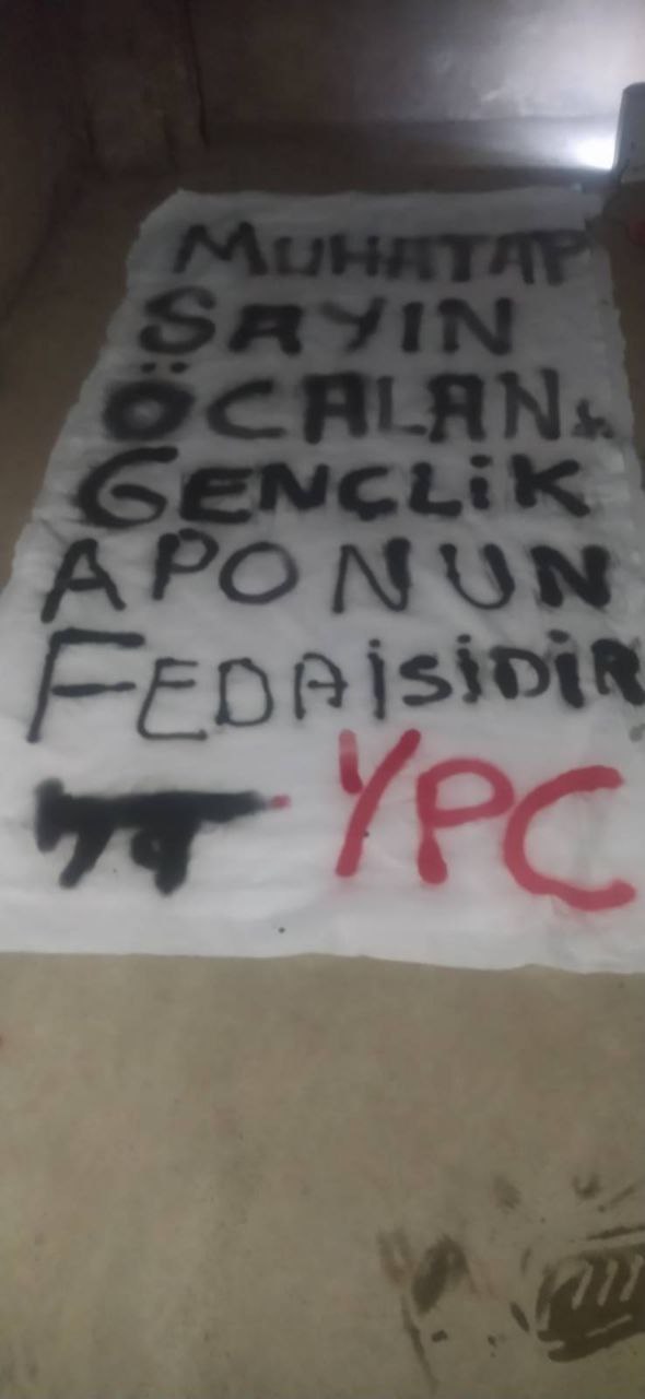 NAVENDA NUÇEYAN- Ji aliyê Milîsên YPC (YPC) ji bo balê bikişînin ser tecrîda mutleq û polîtîkayên îzolasyonê yên li ser Rêber APO û şermezarkirina komployê, li Taxa Yunus Emre ya navçeya Amed Baglarê, pankarta bi nivîsa “Muxatab Birêz Ocalan e, Ciwan fedayên Rêber APO ye” hat daliqandin.