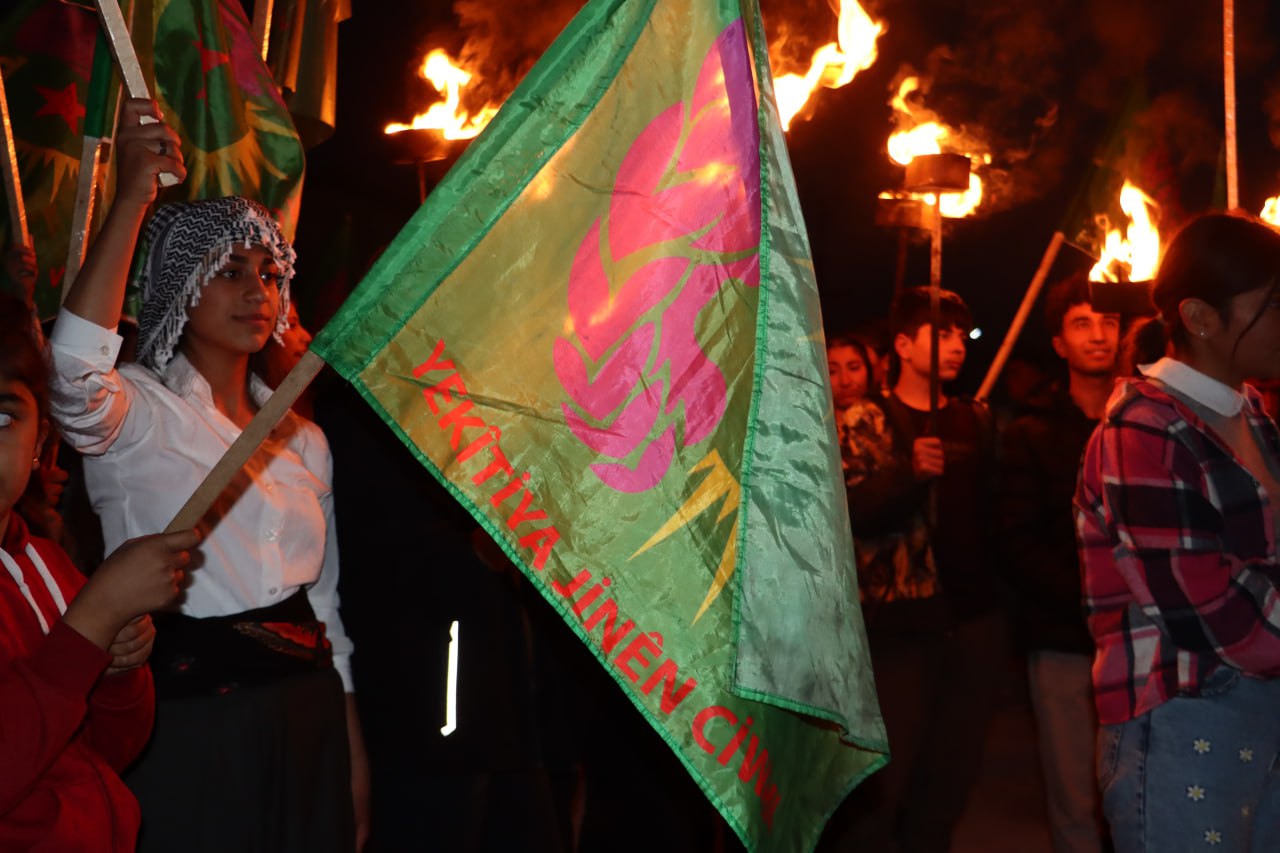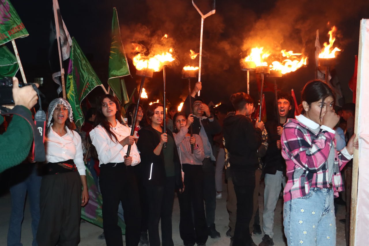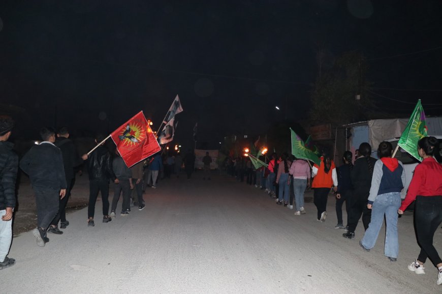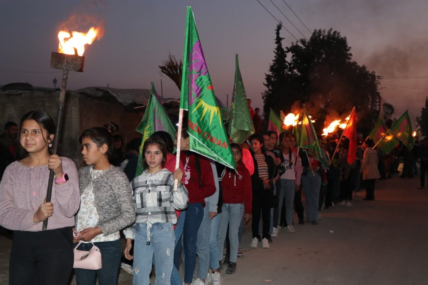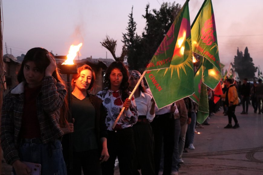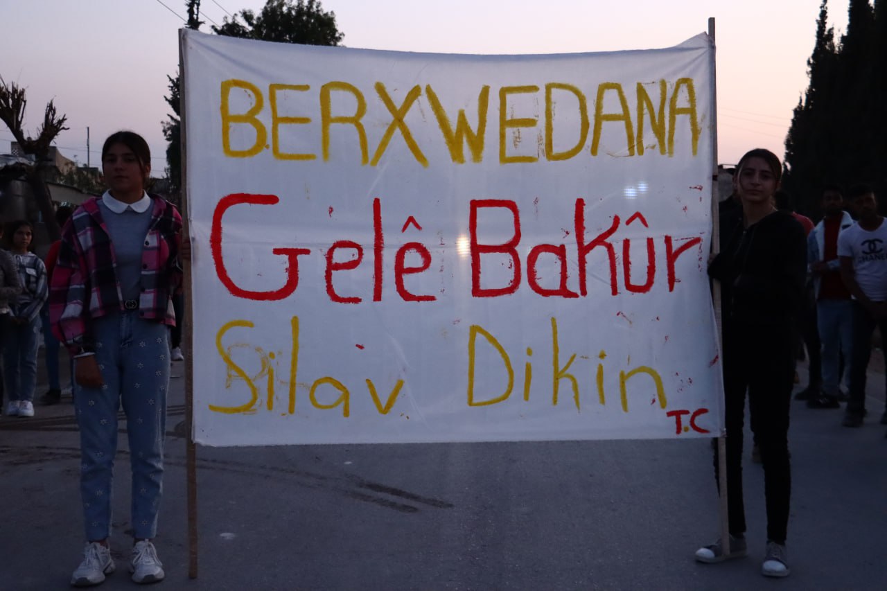 Tevgera Ciwanên Şoreşger a Sûriyeyê û Yekitiya Jinên Ciwan ên kantona Efrîn û Şehbayê bi meşeke gireseyî desteserkirina 3 şaredariyên Bakurê Kurdistanê şermezar kir.
