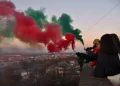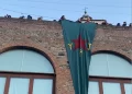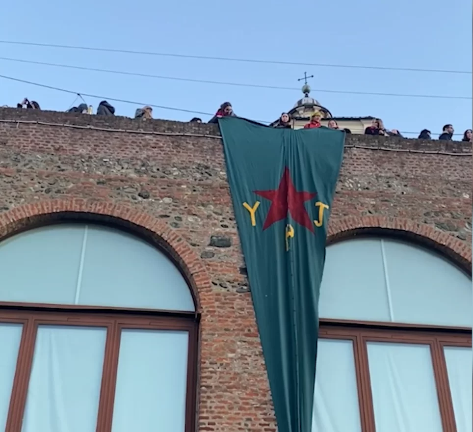 Li bajarê Torîno yê Îtalyayê, jinên ciwan ên enternasyonalîst ala YPJ’ê ya dêw a li bajarê dîrokî Monte dei Cappuccini daliqandin.