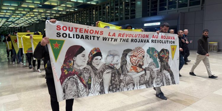 Di çalakiyê de ciwanan timî dirûşmên “Liberté Pour Öcalan”, “Bê Serok Jiyan Nabe”, “Bijî Berxwedana YPG” û “Ciwan Fedayê Rêber Apo ne!” qîriyan. Li balafirgehê bi qîrîna dirûşmeyan dengê xwe bilind kirin.