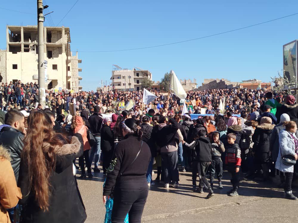 Bi hezar şênî tevlî meşê bûn, ku ji rojhilatê taxa Şêx Meqsûd dest pê kir û li Eşrefiyê bi dawî bû. Al, pankart û şikilên zeytûn hatin hildan. Her wiha, dirûşmeyên “Bijî berxwedana Efrînê” û “Efrînê, em bi te re ne heya mirinê” hatin berz kirin.