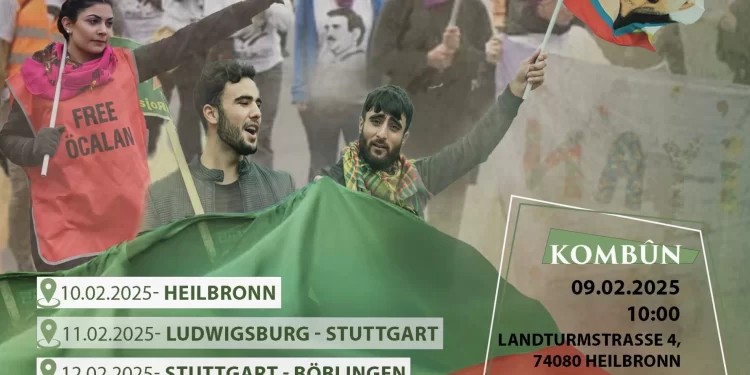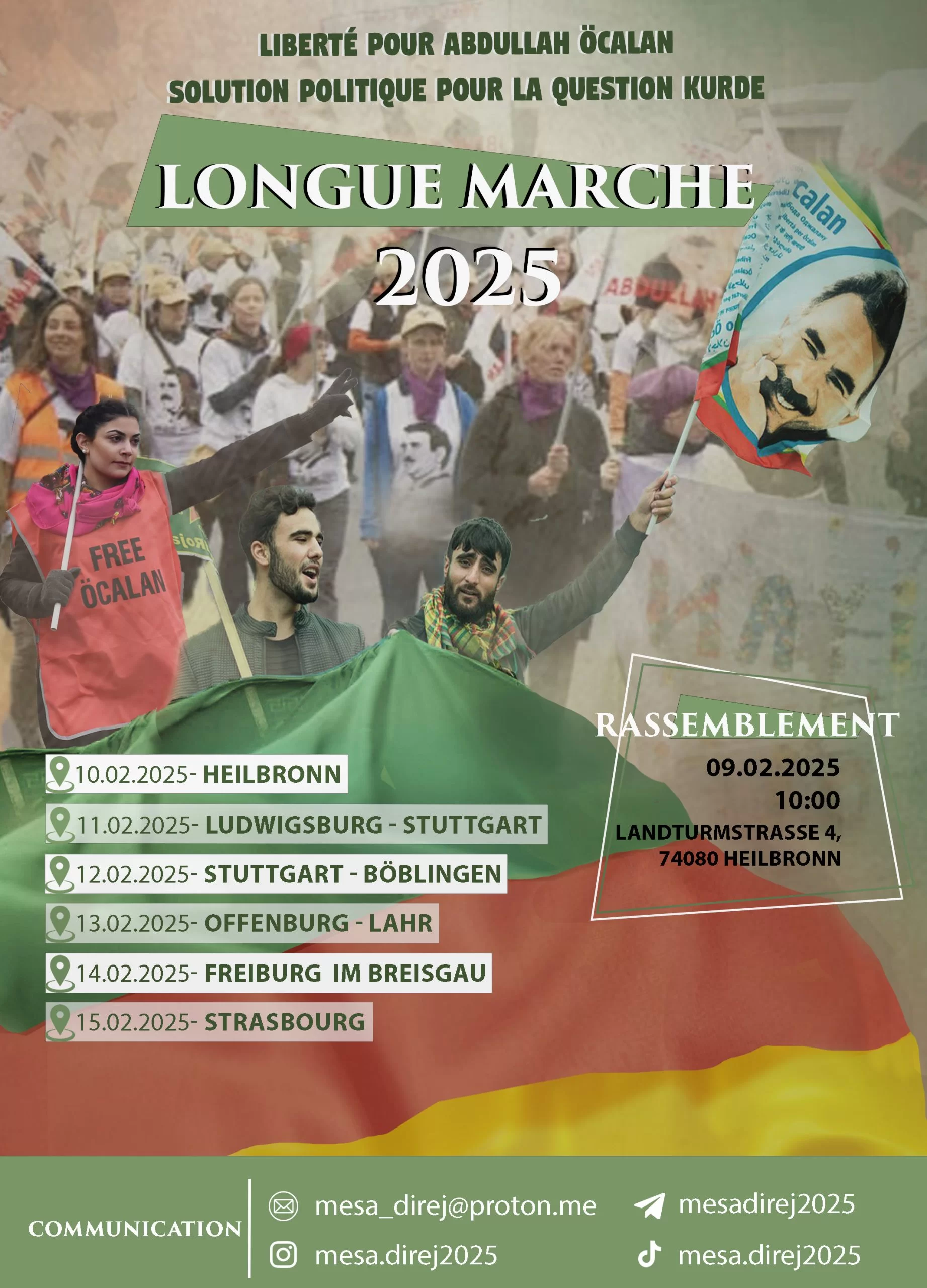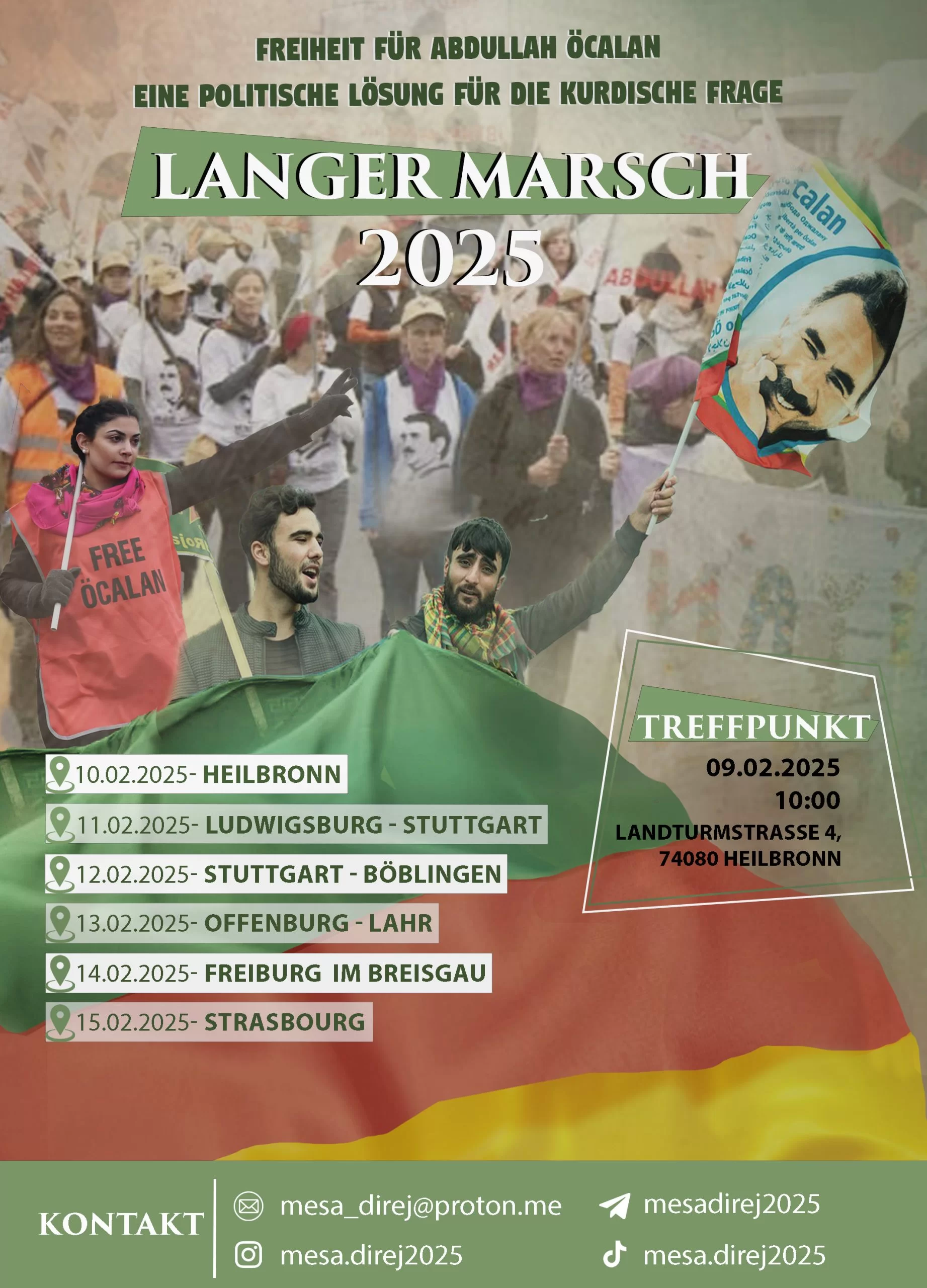 NAVENDA NÛÇEYAN – Ciwanên Kurd û enternasyonalîst ên ji çar aliyê Ewropayê di 9-14’ê Sibatê de ji bo azadiya fîzîkî ya Rêber APO li hev kom dibin. “Meşa Dirêj” ya îsal dê li pênc bajarên Elmanyayê deng vede, ji Heilbronn dest pê dike û bajarên Ludwigsburg, Stuttgart, Offenburg û Freiburg im Breisgau vedigire. 15’ê Sibatê wê li bajarê Strasboûrg ê Fransayê Meşa Mezin bê lidarxistin. Beşdar wê hefteyekê li dijî faşîzm û metîngerî bi hev re bimeşin û peyameke xurt a hevgirtinê bidin.