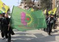 Di meşê de jinan alên Yekitiya Jinên Ciwan, wêneyên Rêber APO rakirin.