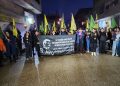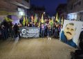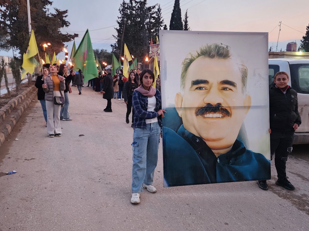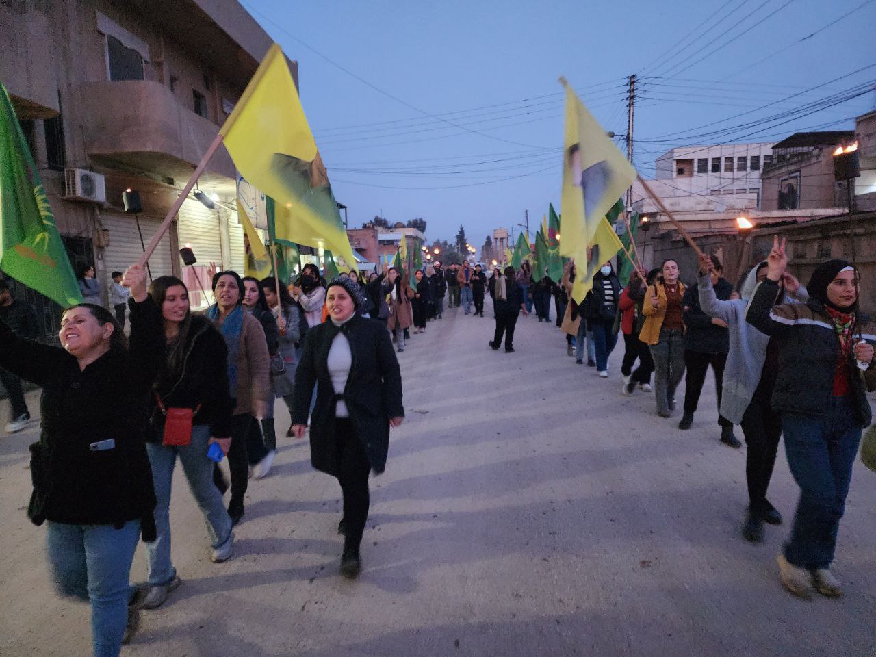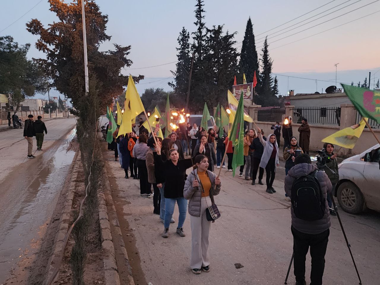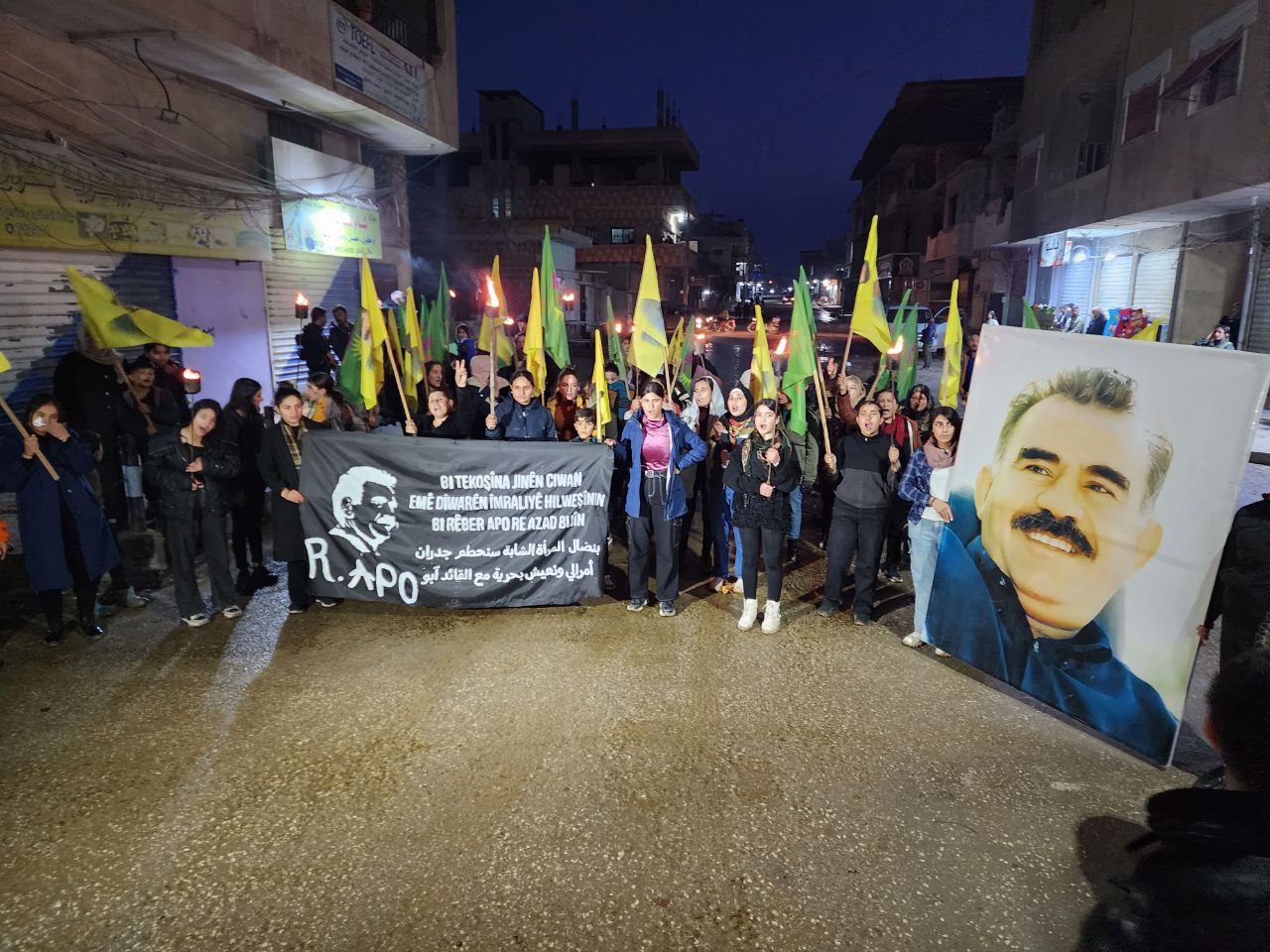 Jinên ciwan li ber navenda Yekîtiya Jinên Ciwan li hev civiyan û alên YJC, wêneyên Rêber APO, meşale û pankarta ku ser de “Bi Têkoşîna Jinên Ciwan em ê Dîwarên Îmraliyê Bişkînin bi Rêber APO re azad bijîn” hatiye nîvisin hilgirtin.