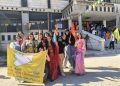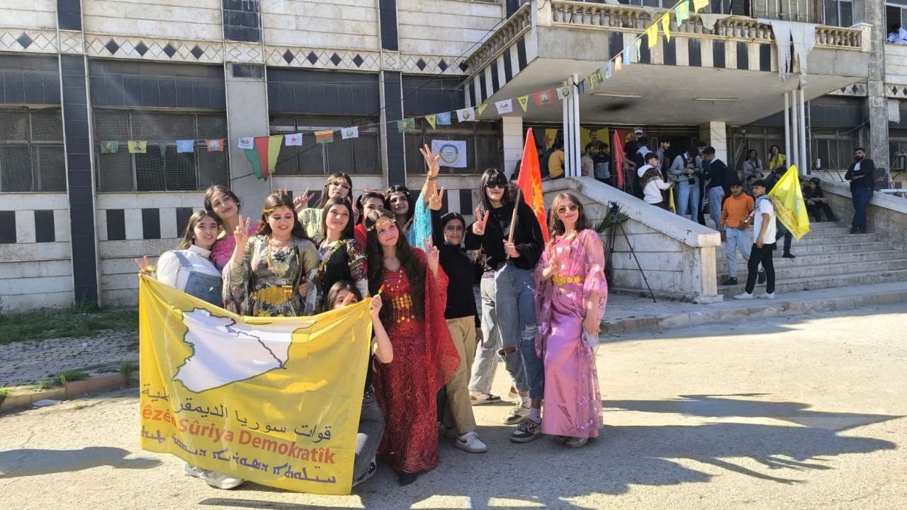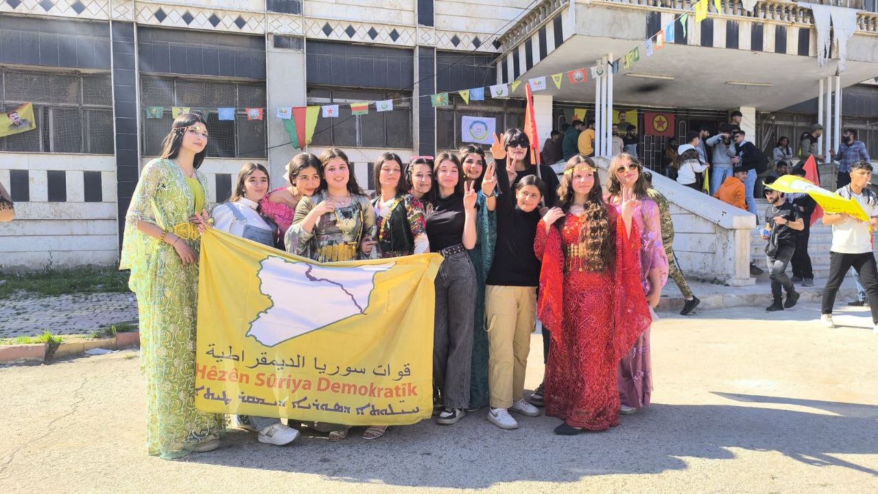 Bi dehan xwendekar agir pêxistin, cil û bergên kurdî li xwe kirin, alên Hêzên Sûriyê Demokratûk û alên Rêber Apo hildan û govendên gelerî gerandin.