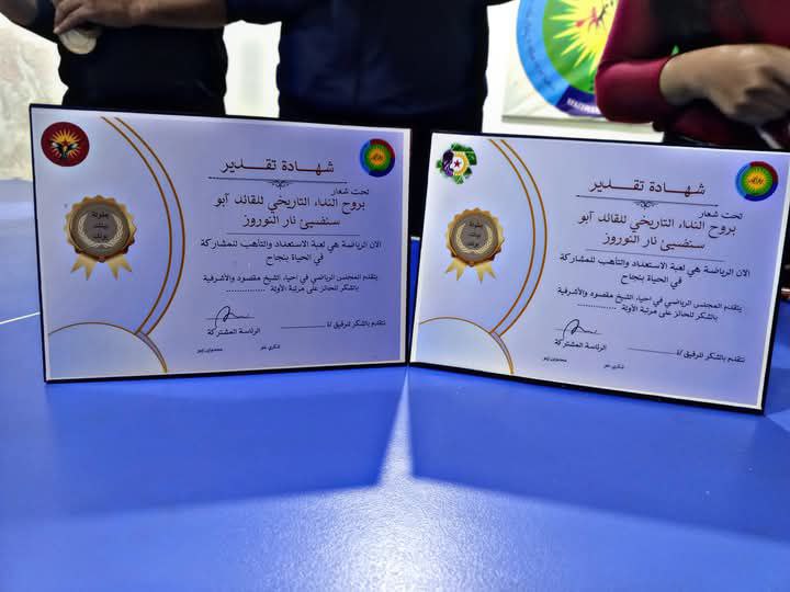 HELEB – Yekitiya Werzîşê ya taxên Şêx Meqsûd û Eşrefiyê yê bajarê Helebê Turnoveyekî “Pîng Pong” bi dirûşmeya “Bi ruhê banga dîrokî ya Rêber Apo, em ê agirê Newrozê pêxin” lidarxist.