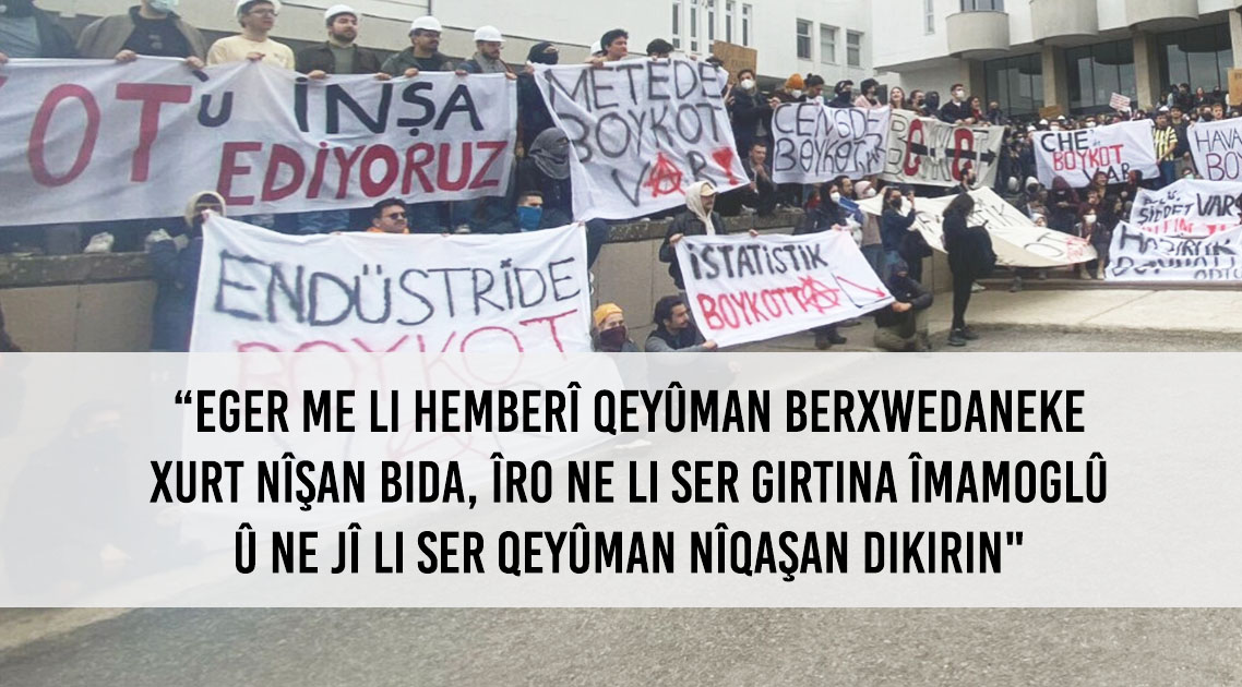 Xwendekarên Zanîngeha Teknîkê ya Rojhilata Navîn (ODTU) ku li dijî girtina Şaredarê Bajarê Mezin ê Stenbolê Ekrem Îmamoglû, polîtîkayên qeyûman, tundiya polîsan û zextên 24’ê Adarê dest bi boykota dersan kirin, banga berfirehkirina boykotê kirin û gotin: “Zext hebe ders nîne.”
