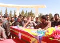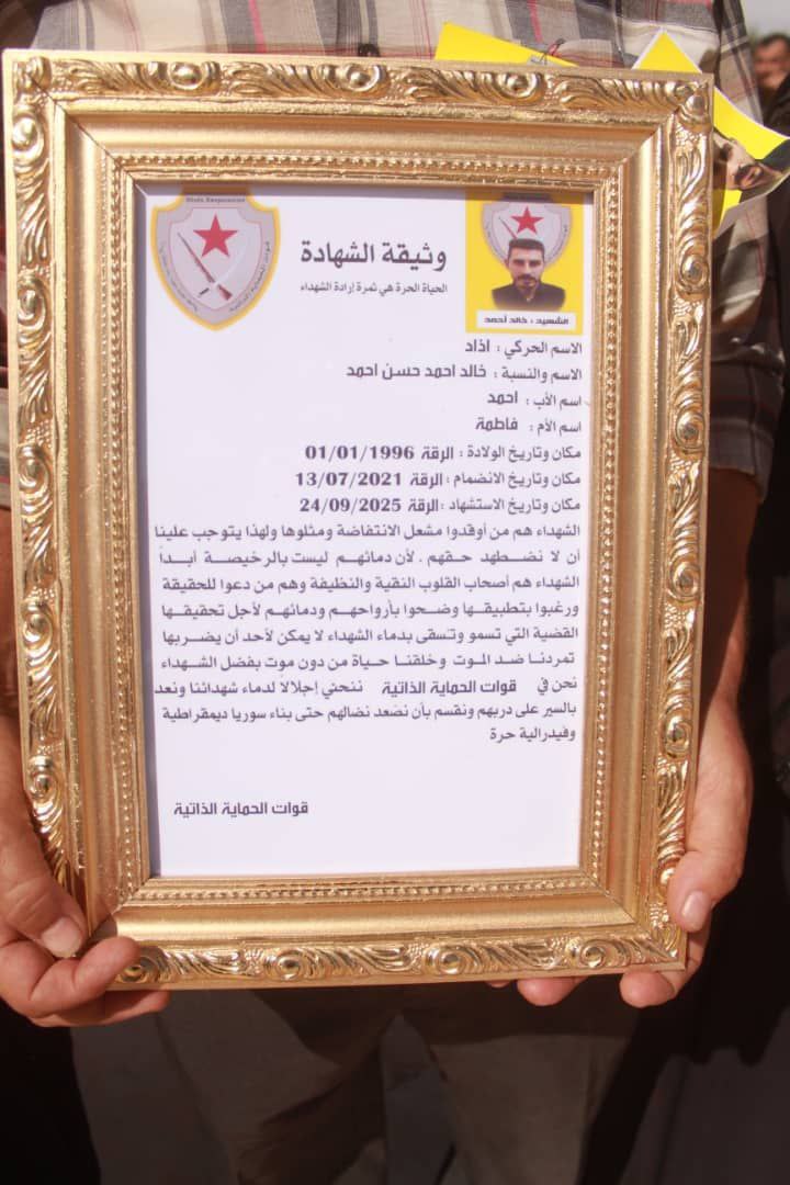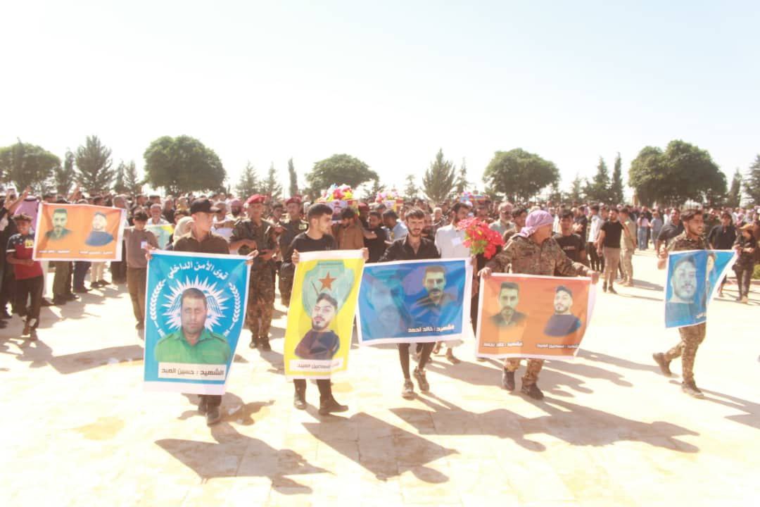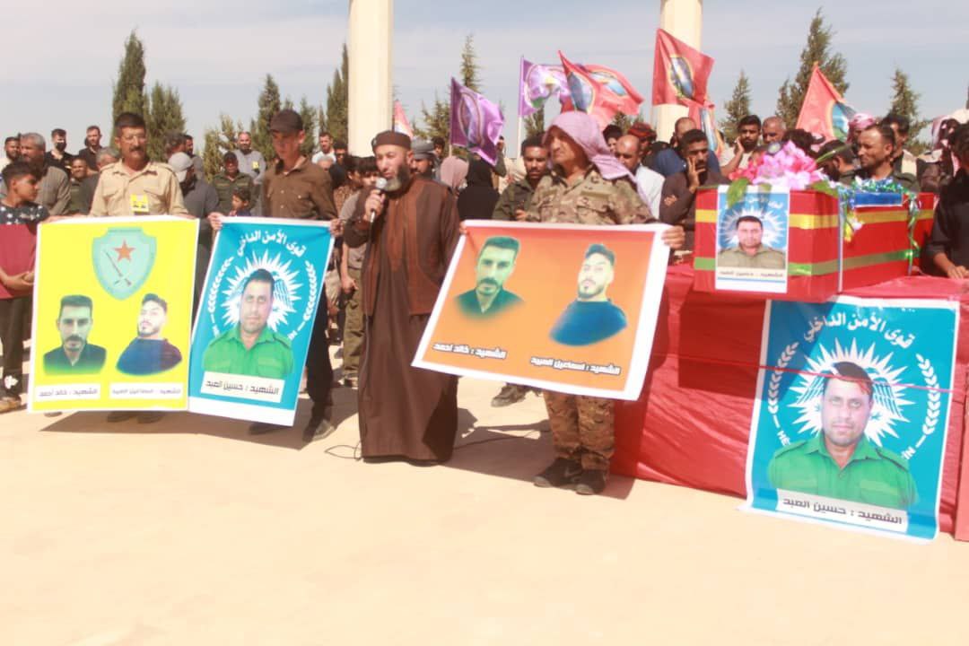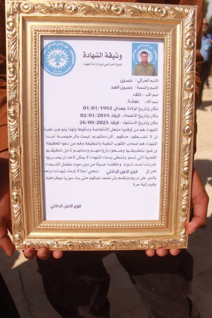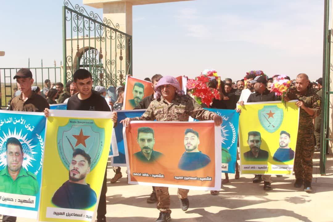 Bi sedan şêniyên Reqayê, endamên saziyên sivîl û leşkerî, tevgerên ciwanan û jinan ber bi Goristana Şehîdan a li bajarokê El-Hokomiye ve çûn da ku beşdarî merasîma cenazeyê endamê Hêzên Ewlekariya Hundirîn Hisên Xelef El-Elî bibin, ku di 26ê Îlonê de dema ku erkê xwe pêk dianî şehîd bû, û du şervanên Hêzên Xweparastinê, Xalid Hisên El-Ehmed û Îsmaîl Mihemed El-Ebd, ku di 26’ê Îlonê de di qezayek trafîkê de şehîd bûn.