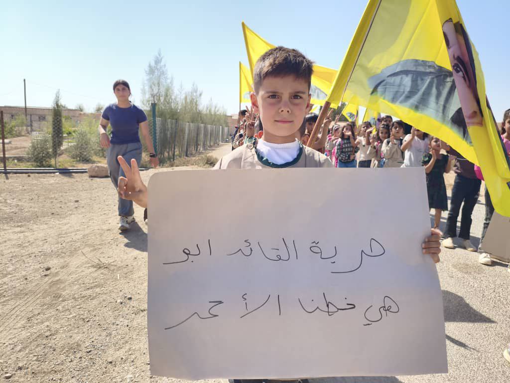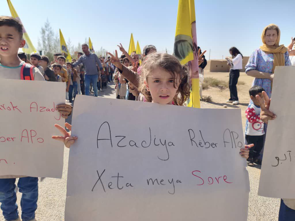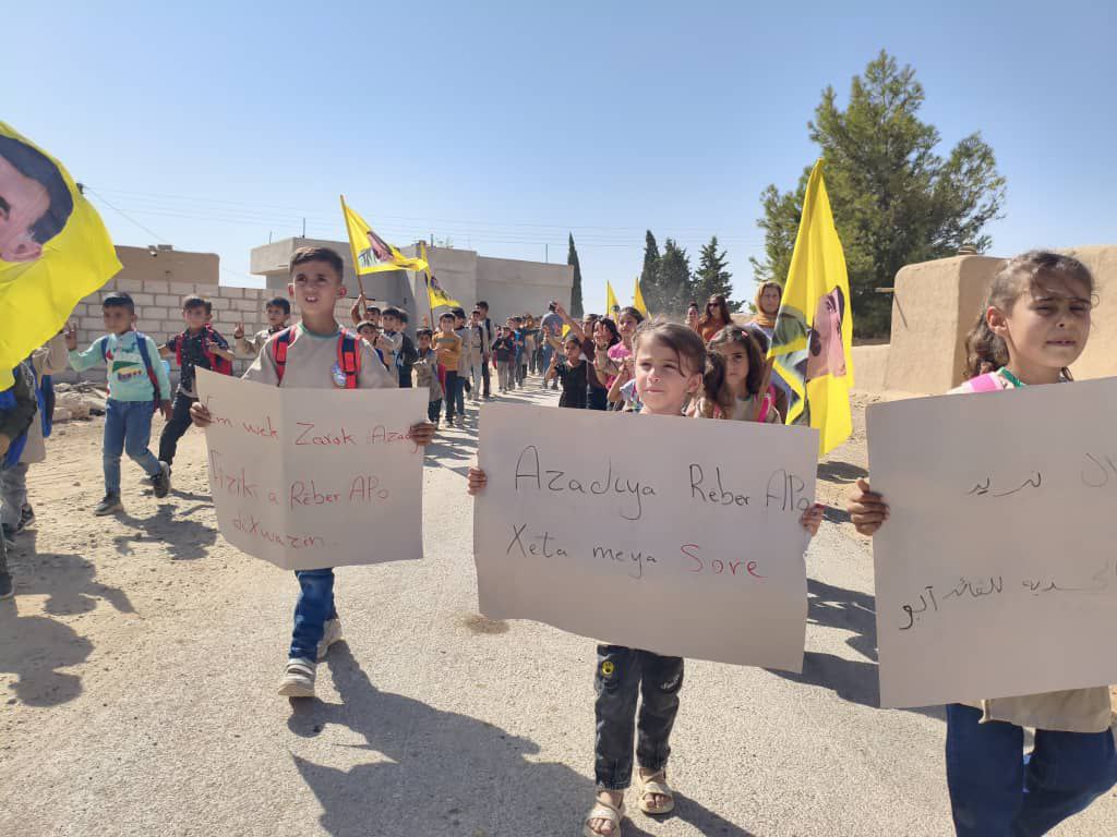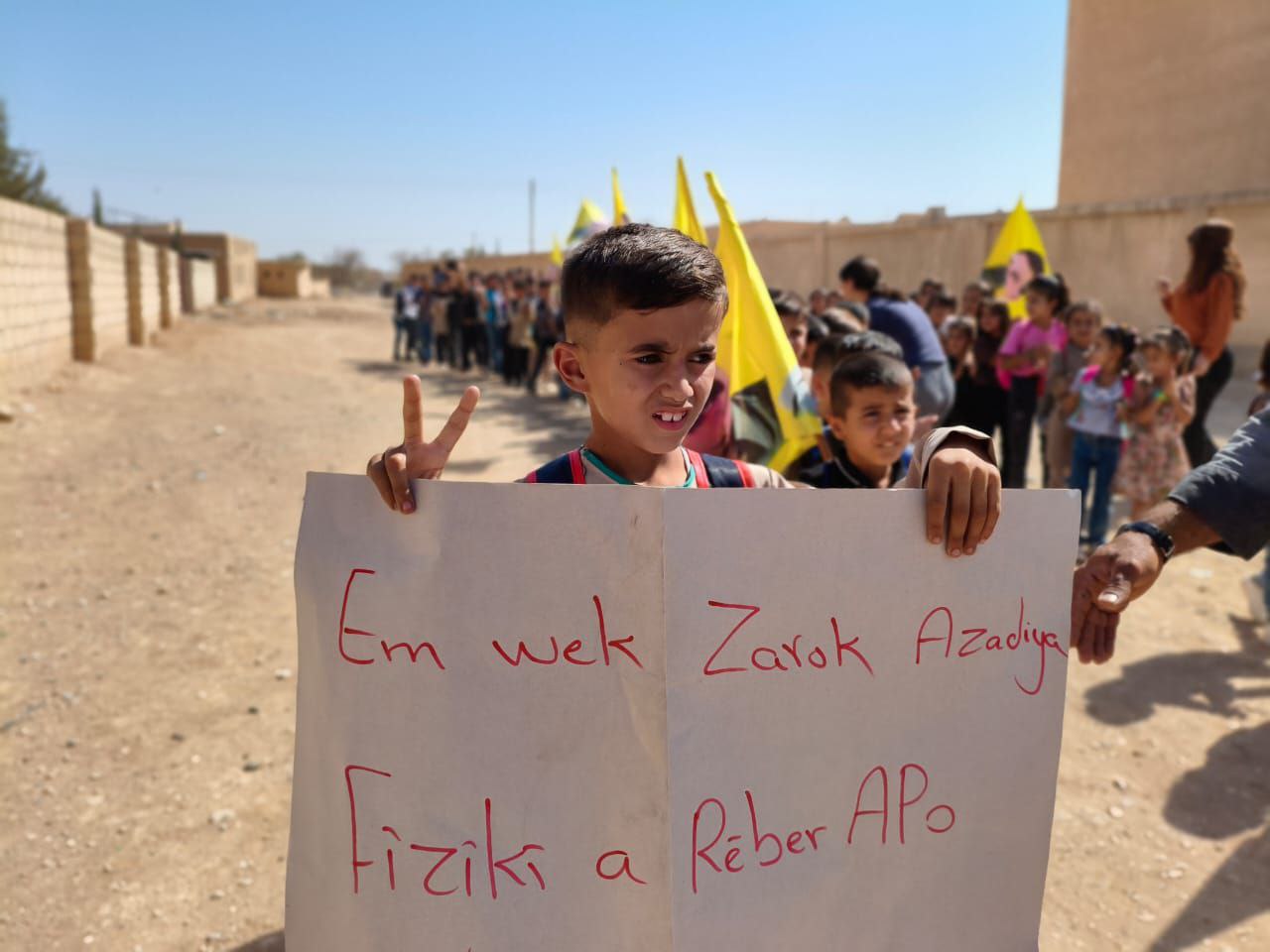 Zarokan alên Rêber Apo hildan û pankartên bi dirûşmeya “Azadiya Rêber Apo xeta me ya sor e”. Zarokan diyar kirin ku ew jî şagirtên Rêber Apo ne û azadiya wî ya fîzîkî dixwazin.