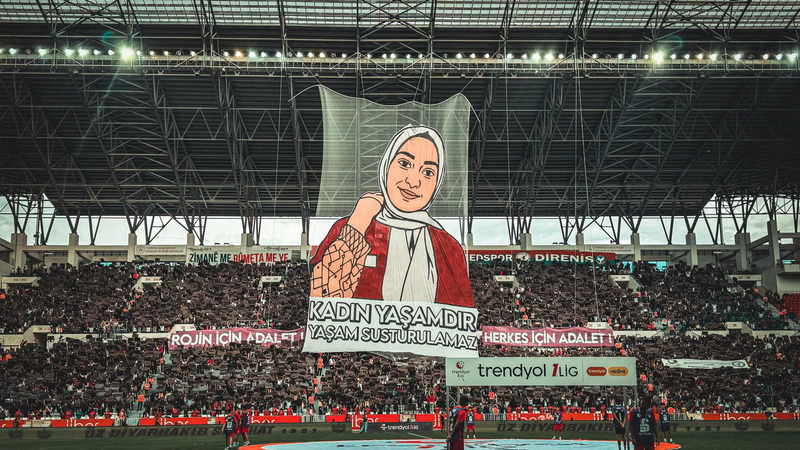 AMED – Alîgirên Amedsporê di maça Îstanbulspor-Amedsporê de posterêk mezin ê Rojin Kabaiş vekirin, ku li ser wê nivîsîbû “Jin jiyan in, jiyan nayê bêdengkirin.”