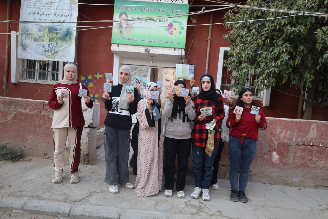 HESEKÊ – Yekîtiya Jinên Ciwan ên Hesekê di çarçoveya kampanyaya “Kom Bibe” de, ku di meha Cotmehê de bi dirûşmeya “Bi Hevaltiya Komînalist bi Rêber APO re Bijî” dest pê kir, çalakiyek belavkirina stîker û broşûran li seranserê bajêr li dar xist.