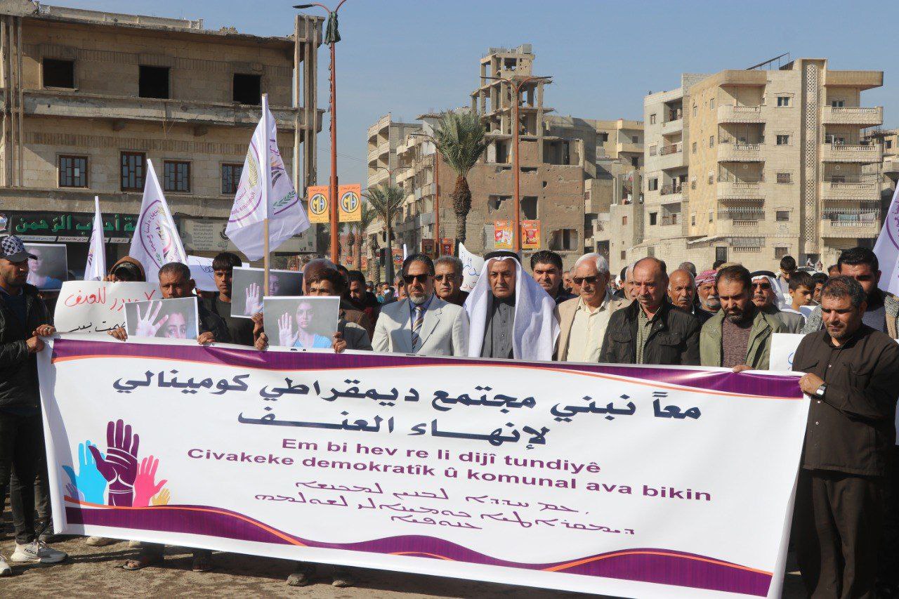 REQA- Meclisa Kombûna Jinan a Zenûbiya bi dirûşma “Em bi hev re li dijî tundiyê civakeke demokratîk û komunal ava bikin” meşek ji bo mêran li dar xist.