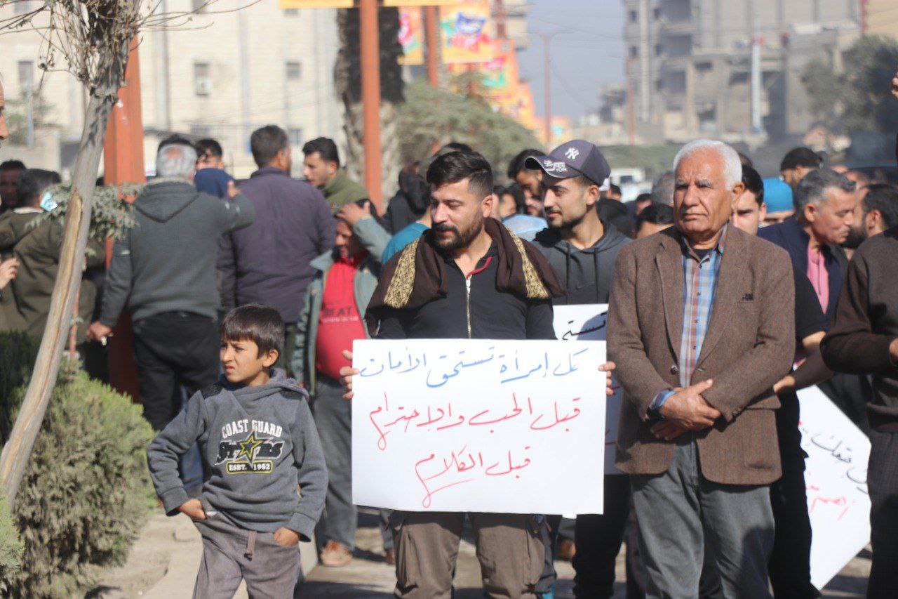 Meşê ji pêş avahiya Meclisa Giştî ya Reqayê dest pê kir û gihaşt Qada Jinê. Li wir hevserokê Meclisa Gelan a Demokratîk a kantona Reqayê Xedîm El Îdan axivî û diyar kir ku divê ew bi hev re civakeke demokratîk ji bo bidawîkirina tundiya li dijî jinan ava bikin.