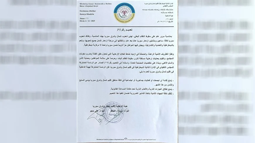 NAVENDA NÛÇEYAN – Desteya Hundirîn a Rêveberiya Xweseriya Demokratîk a Herêma Bakur û Rojhilatê Sûriyeyê biryarnameya 7’an derxist. Di biryarnameyê de salvegera yekemîn a rûxandina rejîma Baasê li gelê Sûriyeyê hat pîrozkirin ku hêviya pêşketin, demokrasî, pirrengî û hevbeşî û azadî di Sûriyeyeke yekbûyî ya nenavendî de hat kirin.