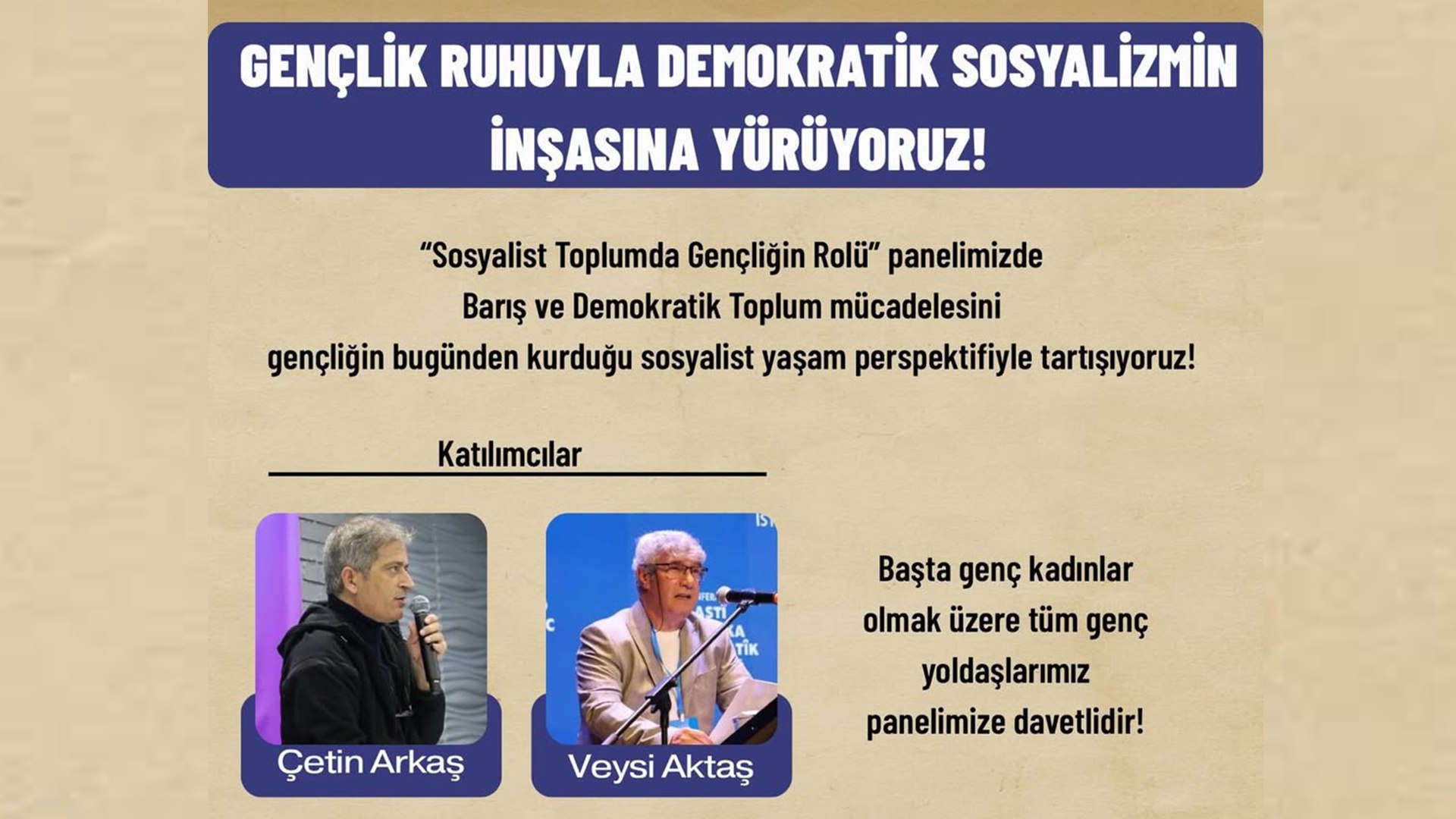 Panel li Stênbol Fatih’e Su Gösteri Sanatları Sahnesi’ye bi beşdariya Çetîn Arkaş û Veysî Aktaş de bibe. Panel di 28 Kanûne saet 11.00 de bi sernivîse ‘Di Civaka Sosyalist de Rola Ciwanan’ de pêk be.
