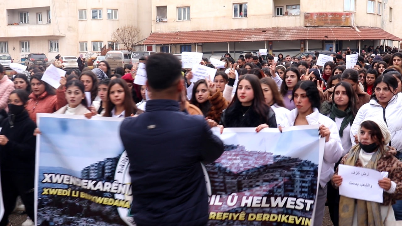 KOBANÊ – Yekîtiya Xwendekarên Welatparêz li bajarê Kobanê ji bo xwedî derketina li berxwedana taxê Şêx Meqsûd û Eşrefiyê meşekî girseyî li darxist. Bi hezaran xwendekarên zanîngehê helwestê xwe beramberî teslîmbûnê li ber çeteyên girêdayî hikûmeta Şamê û dewleta Tirk nîşan dan.