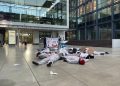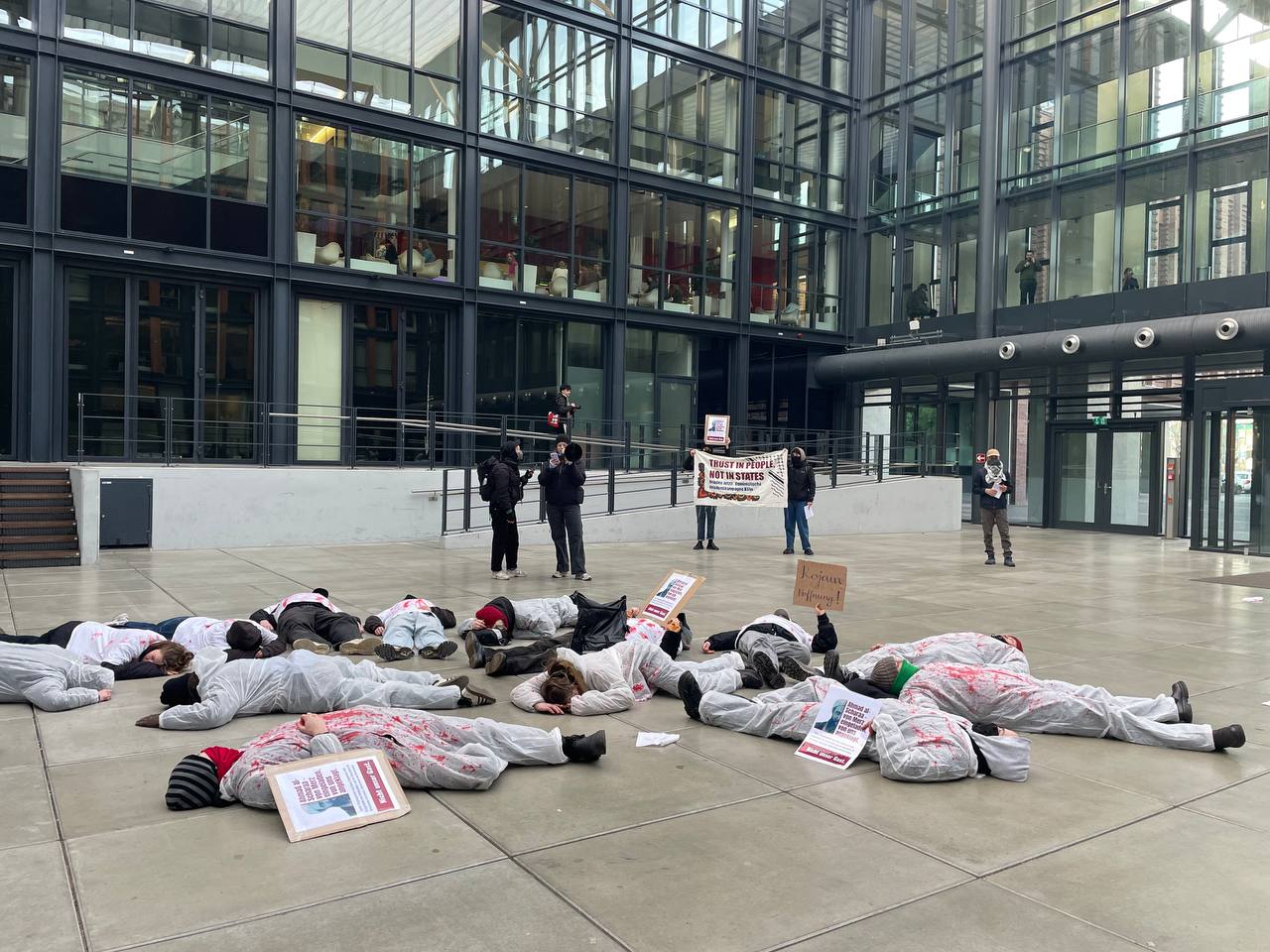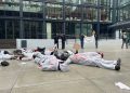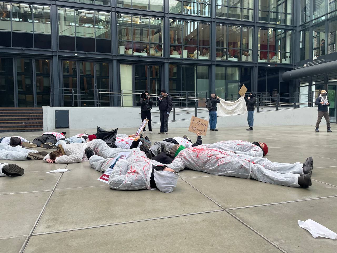 Her wiha, ciwan bi cilên xwînî li erdê dirêjkirî bûn û şanoyek pêşkêş kirin. Di dema şanoyê de, broşûrên ku li ser Colanî, terorîstekî ku di êrîşên li ser Rojava de beşdar bûye, agahdariyên berfireh li kesên li derdorê belav kirin. Her wiha, dosyayên têkildarî Rojava dan karmendên li herêmê dixebitin.