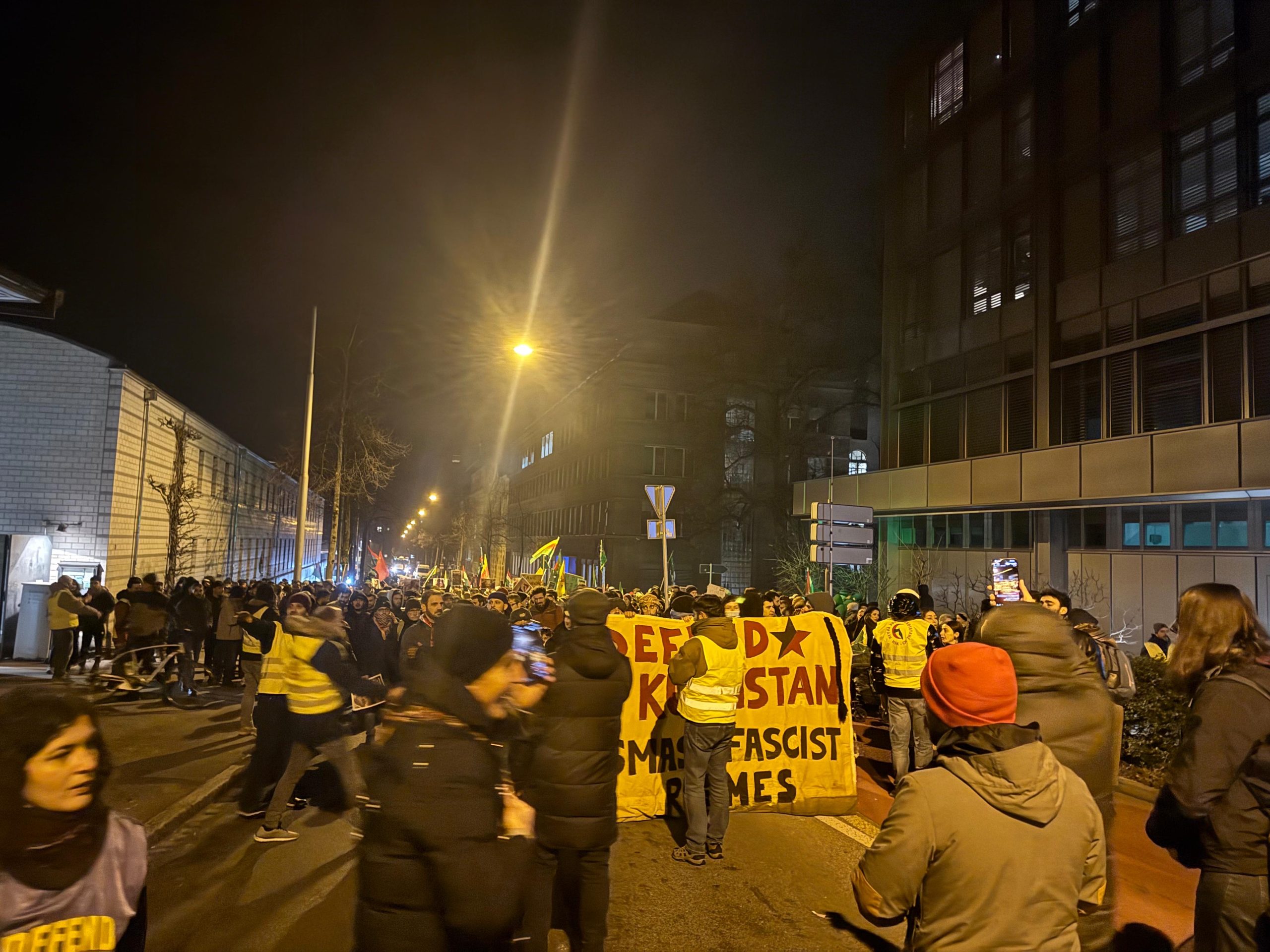 Piştî ragirtina kêliyek bêdengiyê, girseya ku demek din li ber konsulxaneyê dirûşmeyan berz kir, bi meşa xwe ber bi Parlamentoya Swîsreyê ve çalakiya xwe domand. Xwepêşander tevlî çalakiya nobedê ya li ber parlamentoyê bûn.