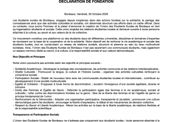 Xwendekarên Kurd li Bordeaux demek dirêj e li ser bingeha hevgirtinê, parvekirina agahiyan û çalakiyên çandî û civakî bi hev re dixebitin, û ev hewildan niha fermî bûne. Di vê çarçoveyê de, em bi serbilindî û rêzdarî damezrandina Yekîtiya Xwendekarên Kurd ên Bordeaux wekî rêxistinek xwendekar û civakî radigihînin. Ev yekîtî têkiliyên xwendekarên herêmî digire nav xwe û deriyên xwe ji bo tevahiya civaka ku qîmetê dide çand û zanînê vekirî dihêle.