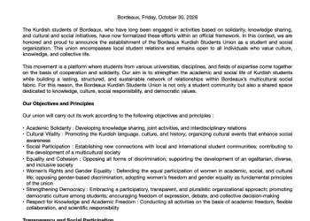 Daxuyaniyê bi şirovekirina armancên rêxistinê berdewam kir: “Yekîtîya Xwendekarên Kurd ên Bordeaux ne tenê komeleyeke xwendekaran e, lê di heman demê de zemînek hevpar ji bo hevgirtinê di warên zanîn, çand, berpirsiyariya civakî û nirxên demokratîk de ye.”