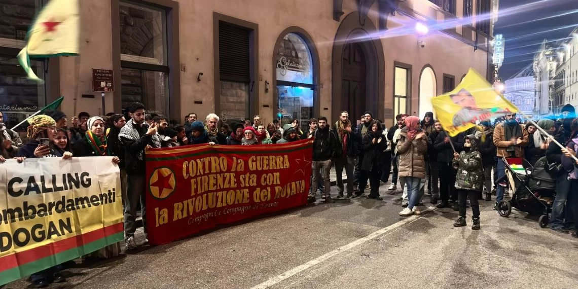 FLORENSA – Xwepêşandana li Floransayê li Meydana Santa Maria Novella bi beşdariyeke xurt a ciwanên Kurd dest pê kir. Ji wir, girse bi qîrîna dirûşmeyan ber bi Waliyê Floransayê ve meşiya. Di tevahiya meşê de, gelek caran dirûşmeyên ku azadî, edalet û biratiya di navbera gelan de tekez dikirin hatin qîrkirin.