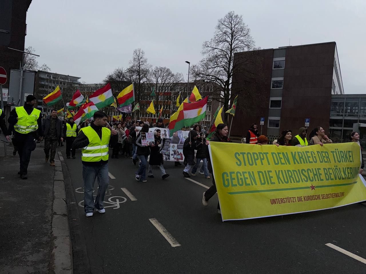 Piştî van daxuyaniyan, girse meşê xwe heta Ludgeriplatz domand. Ji wir ve dîsa heta stasyona trenê ya navendî meş hate domandin. Di meşê de pankart û dövîzên ku tawanên şerê li Rojava hatine belgekîrî di destan de hatin girtin.