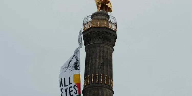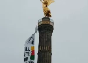 Ciwanan pankartek 15 metre dirêj a bi nivîsa “Hemû çav li ser Kobanî ne” li ser Siegessäule, abîdeya dîrokî û sembolîk a li paytext Berlînê daliqandin.
