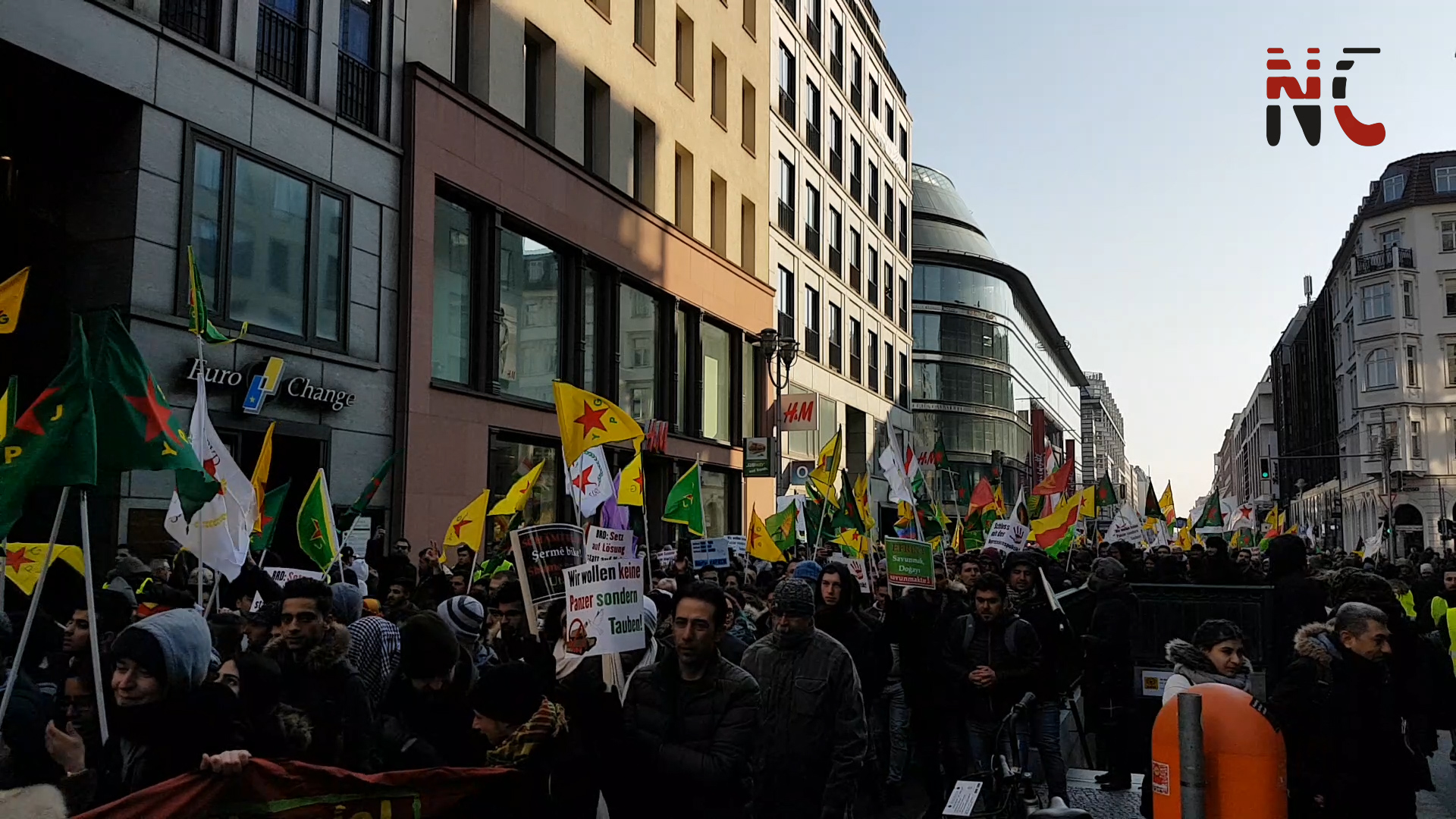 Bi sloganên “bijî berxedana Efrînê” meş dest pêkir. Di meşi de polîsên Alman êrîşî welatiyan kir. Lê ciwanan bersiva wan dan û xwe parastin. Di encam de du “2” ciwan hatin bin çavkirin. Lê jiber ku ciwanan li ber xwe da polîsên Alman mecbur man herdu ciwanan berdin.