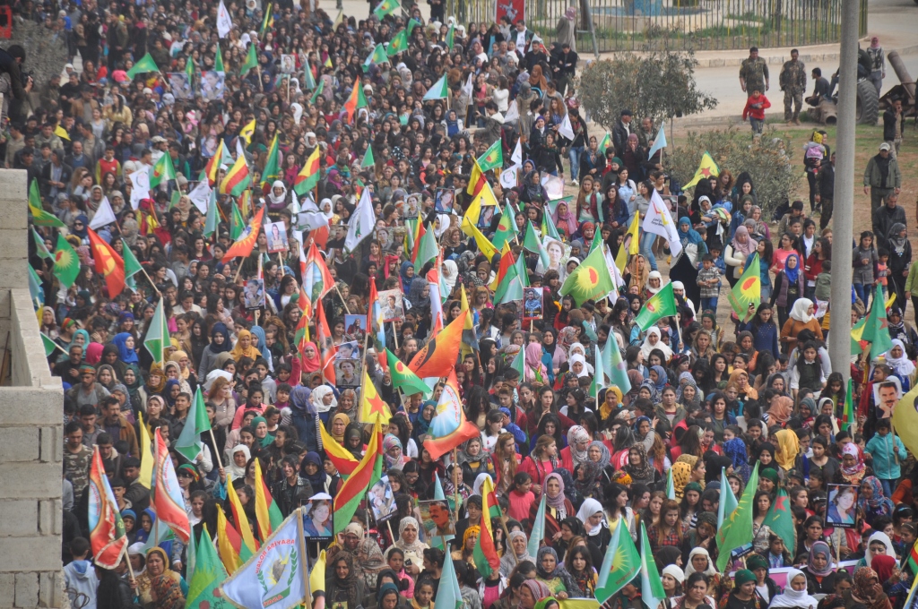 KOBANÊ – Bi hezaran jinên û jinên ciwan ji Kobanê, Girê Spî û Sirîn li Qada Şehîd Egîd kom bûn û ji wir dest bi meşê kirin. Jinan alên YPJ/YPG/QSD û wêneyên Rêberê Gelê Kurd Abdullah Ocalan rakiribûn. Her wiha meşvanan pankêrtaʺEy jin ji bo Efrînê dakevin qadan, parastina Efrînê parastina şoreşa jinê yeʺvekiribûn.