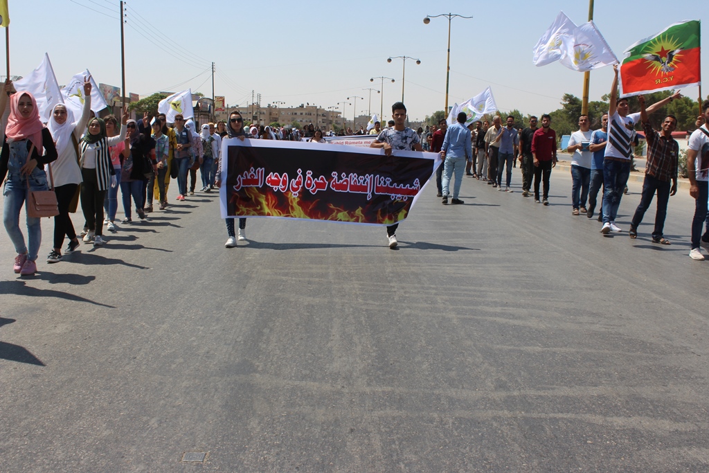 HESEKÊ – Yekîtiya Ciwanên Rojava ya Hesekê li dijî dagirkeriya Dewleta Tirk li ser Başûrê Kurdistanê meşek li dar xist. Meşa ciwanan ku ji çerxeriya Îtfaiyê dest pêkir, ber bi navenda ciwanan ve meşiya. Ciwanan di meşê de alên YCR, YJC û wêneyên Rêberê Gelan Abdullah Ocaln hildan.
