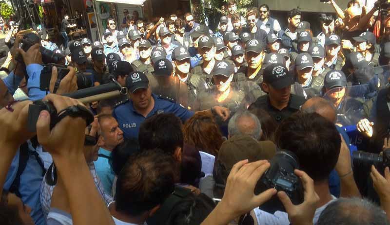 NAVENDA NUÇEYAN – Dayîk li pêşiya ÎHD’ya Stenbolê hatin ba hev û bi wêneyên windayan xwestin bimeşin Qada Galatasarayê. Polîsan êrîşî komê kir a ku Hevseroka Giştî ya HDP’ê Pervîn Bûldan jî di nav de bû. Polîsan xwest her kesî têxe avahiya ÎHD’ê.