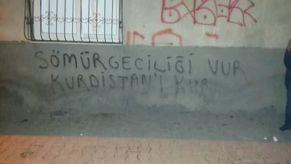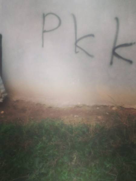 Heman şevê li ser dîwaran nivîsa ‘Li mêtîngeran bixwe Kurdistanê biparêze’ , ‘PKK’ û ‘Ji madeyên hişber re na’ hatin nivîsan.