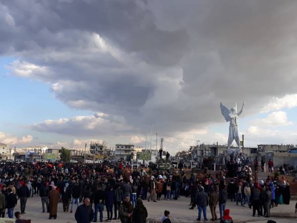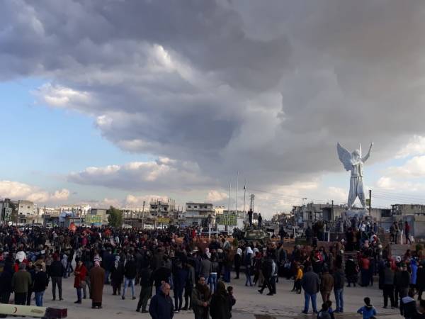 NAVENDA NÛÇEYAN- Gelê Kobanê, ji bo şermezarkirina gefên dewleta Tirk ên ji bo dagirkeriyê, li dora peykerê Jina Azad ê li navenda bajêr li hev dicive.