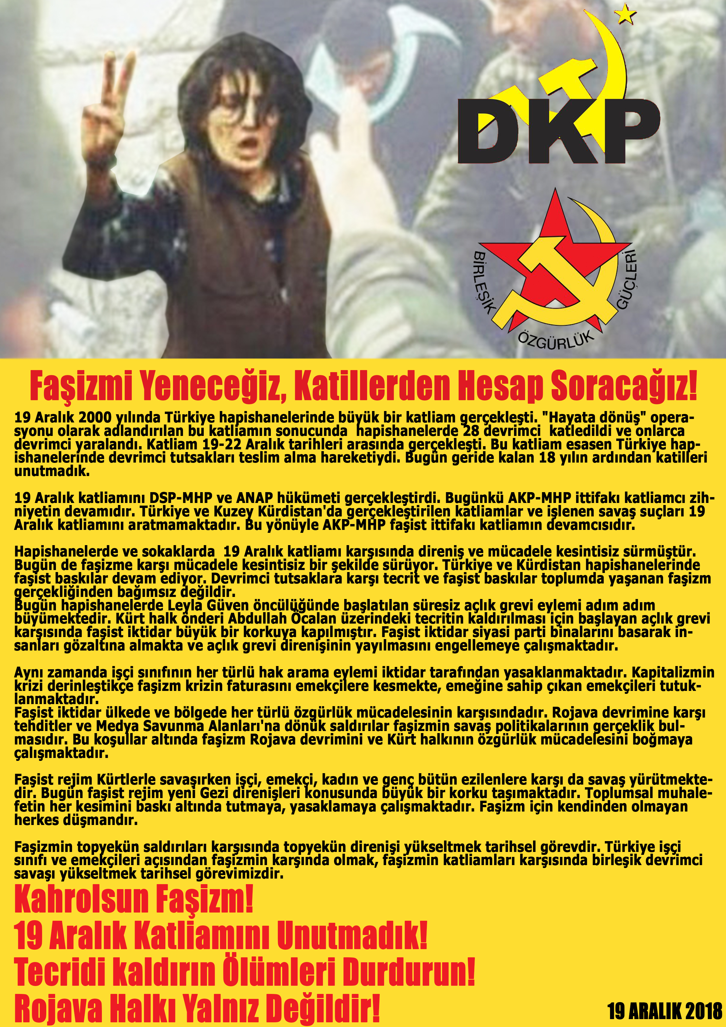 DKP/BOG bi wesîleya salvegera 18’an a komkujiyê peyameke nivîskî weşand û got, “Ev komkujî hewldanek ji bo teslîmgirtina girtiyên şoreşger ên li girtîgehên Tirkiyeyê bû. Tevî ku 18 sal di ser re derbas bûne, me kujer ji bîr nekirine.”