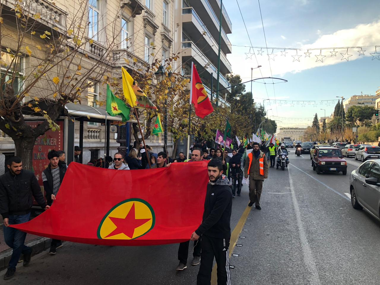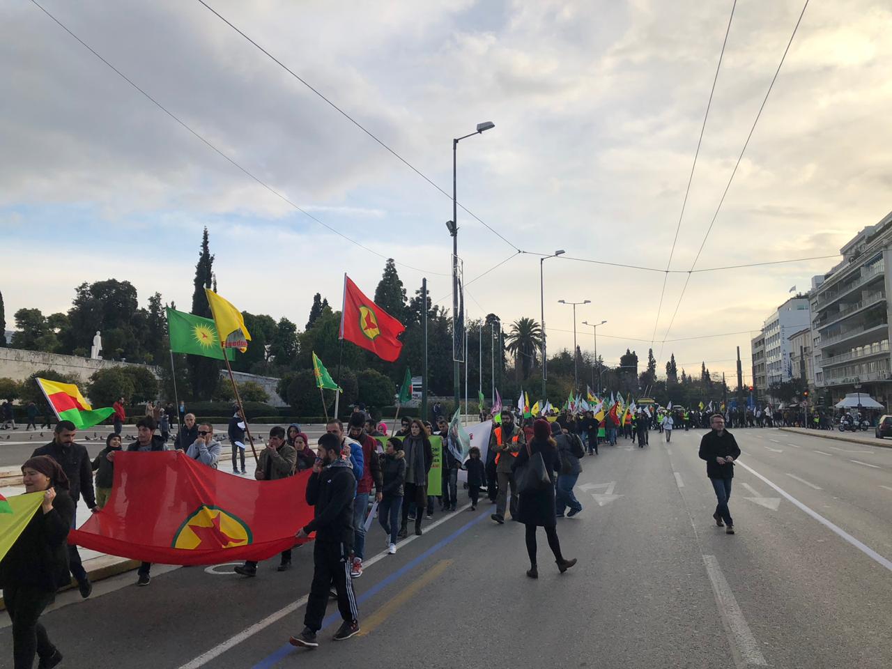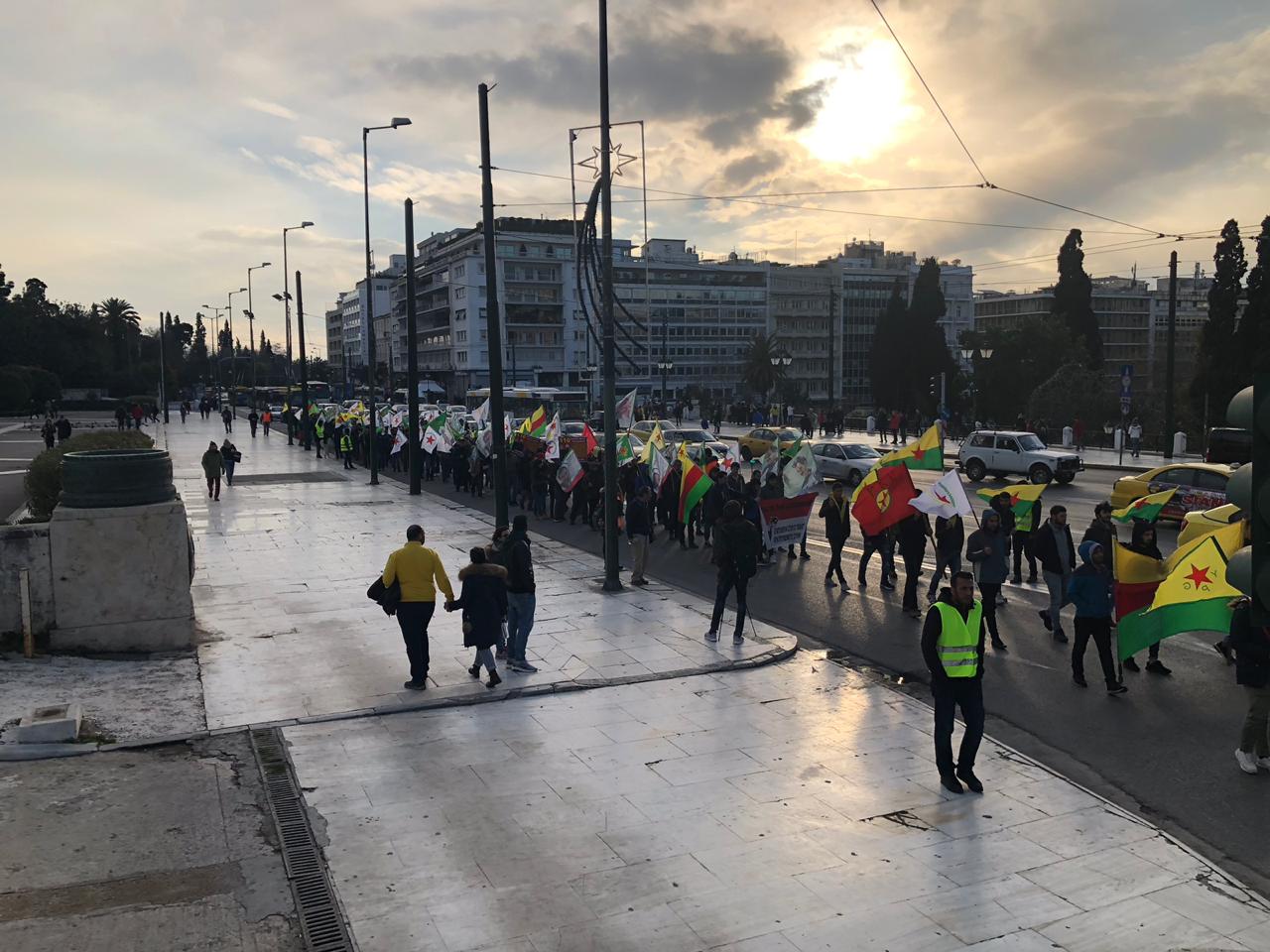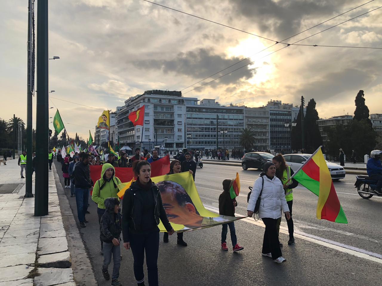 Meş li qada nav u deng a Syntgmanê destpêkir. Çepgir u sosyalîstên tirkiyê bi tevê dostên Yewnanî jî di meşê de cihê xwe girtin. Sedan kes bi posterên Rêberê Gelan Abdullah Ocalan û alên PKK, HPG û YPG ê meşiyan. Di meşê de diruşmên; ”Bijî Serok Apo”, ”Bijî Berxwedana Zindanan”, ”Bê serok jiyan nabe”, Kurdistan goristan ji bo faşistan”,”kujer Erdoxan u kujer Tirkiye hatin avêtin. Ciwan û gel heta ber konsulxaneya Tirkiyê meşiya. Li ber konsulxaneya tirkiyê ji bo şehîdên şoreşé dekekî rêz hate girtin û çerxa şoreşê hate xwendin.