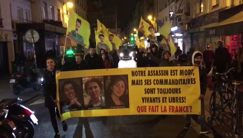 PARÎS- Aktivîstên Tevgera Ciwanên Şoreşger duh şevê li Navenda Parîsê li dijî qetlîama Parîsê meşek li dar xistin. Ciwanên ku bi ala Rêberê Gelan Abdullah Ocalan meşiyan li Garê du Norda bê navber bi diruşman berz kirin. Ciwanan bi dirûşmê, bi panqartên ku suretên Şehît Sara, Şehît Rojbîn û Şehît Ronahî hebû berpirsiyariya vê qetlîamê protesto kirin. Li ser panqartên hatine amadekirin de bi Frensî nivîsa ‘’Kujerê me mir. Lê yê ku fermanê dan hêj jî dijîn û Azadin! Fransa wê çi bike?’’ hatibû nivîsandin.