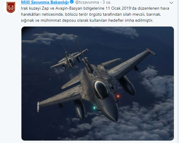 NAVENDA NÛÇEYAN- Artêşa Tirk ê dagirker her roj ku cihekî din dixwaze dagir bike û her wiha li Başûrê Kurdistanê jî dixwaze bi êrîşên hewayî ev dagirkeriya xwe kurttir bike. Hesaba TSK li ser Twitterê her roj pişte êrîşên hewayî li axa başurê Kurdistanê bi heman zimanê daxuyaniyek dide. Di daxuyaniya xwe de jî wêneyekî balafirê parve dike.